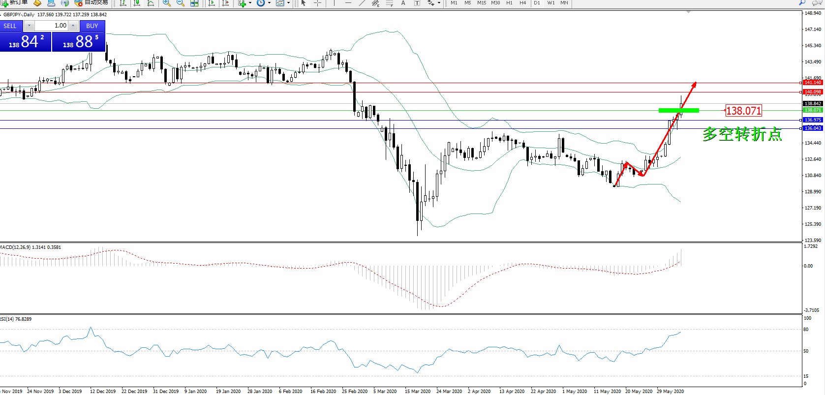 技术点评:多头动力延续布林带指标上轨附近不断拉升上扬中,布林带指标呈张口走势中,多头动力有进一步上行态势,前期高位下方支撑现在已经转为关键压制节点,MACD指标处于0轴线上方多头区域不断上扬中,RSI指标处于多头区域持续震荡上扬至超买区80均衡线下侧徘徊;