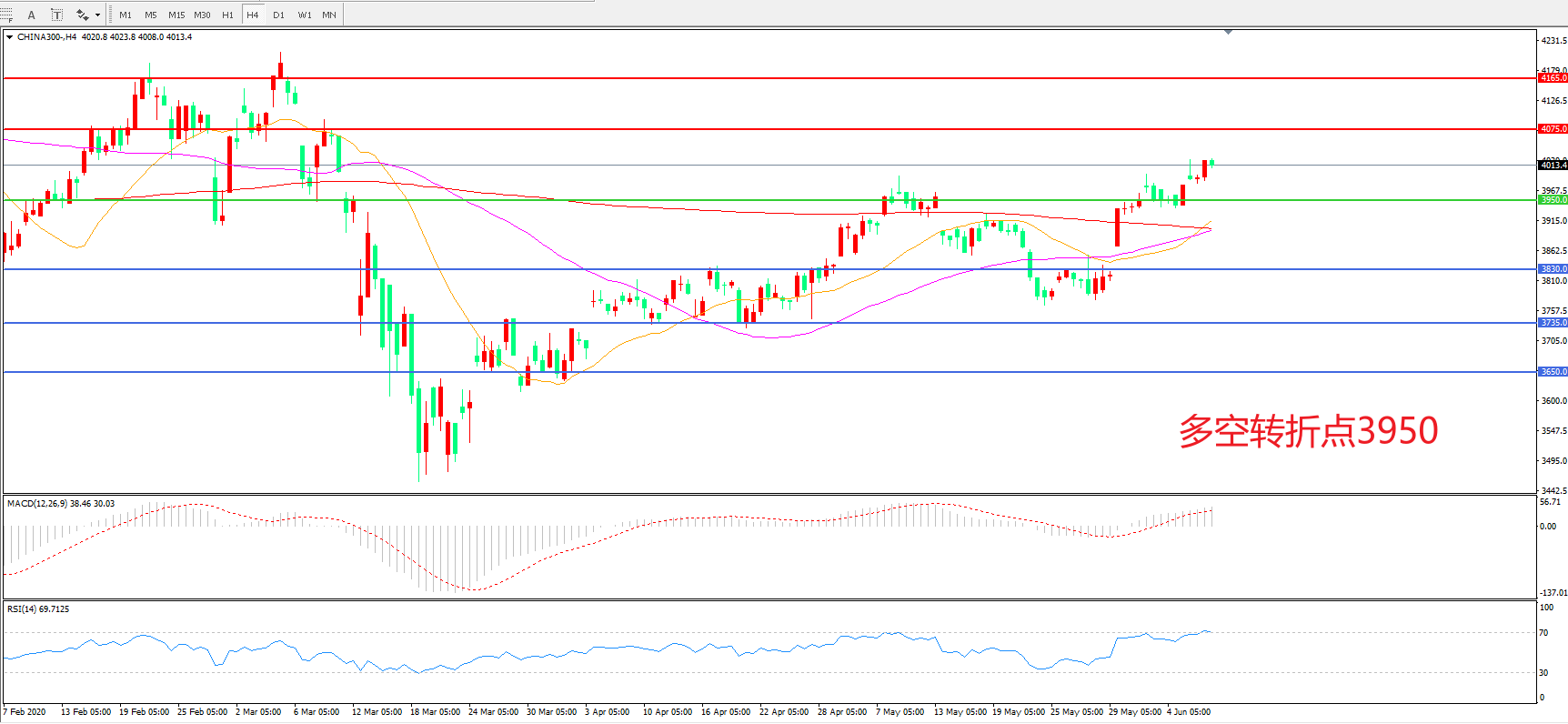 4小时图看,沪深300延续高位震荡,整体表现较为平稳,低点逐渐抬高,均线系统有拐头迹象,MACD红柱增加,RSI指标走平,日内延续上行概率较大。