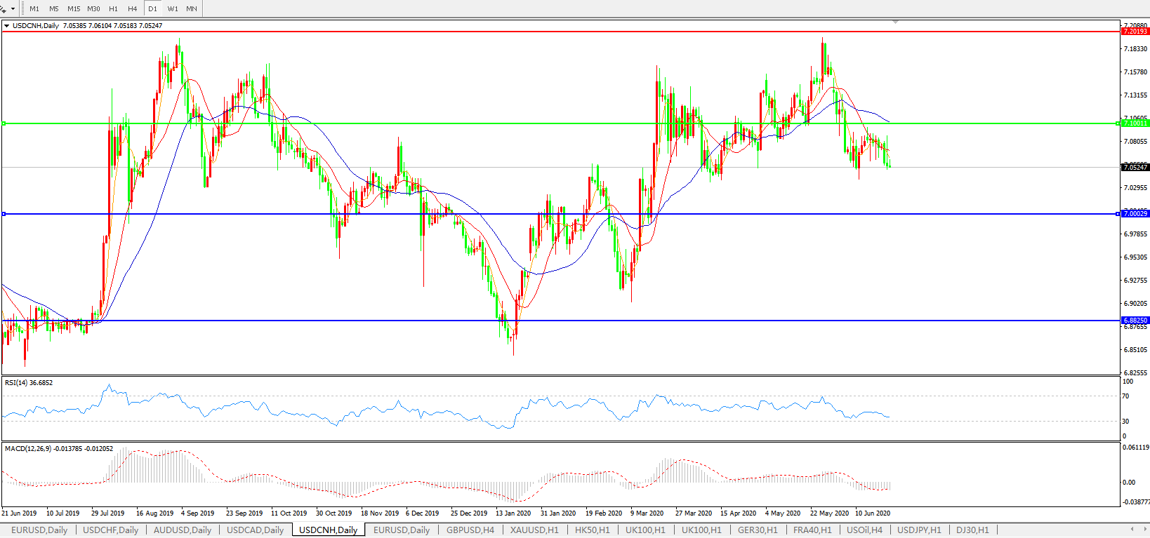 技术面简析:日图均线呈有序空头排列,汇价连日整理后开始下行,MACD运行于0轴下方且量能0轴下小幅放量,RSI持续走弱,预计短期汇价或将进一步下行,关注7.00关口支撑。