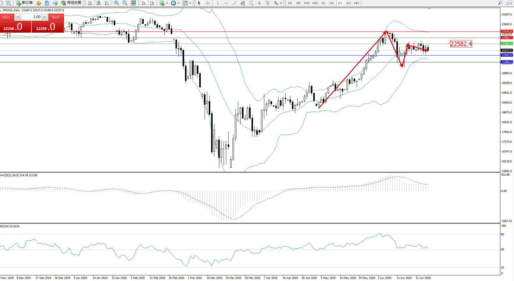日经225指数6月26日(周五)收盘上涨263.71点,涨幅1.18%,报22523.50点。日本央行行长黑田东彦表示,该行达到2%的通胀目标将需要相当长的时间,但实现这一目标的立场没有改变;一旦大流行结束后经济恢复正常,央行将削减特别疫情应对措施,将在必要时毫不犹豫地做央行应当做的事情;由于疫情大流行,日本的经济处于极为严峻的状况,从今年下半年开始经济复苏不无可能;日本第二季度国内生产总值可能出现“相当大的”负增长,如有必要,将降低整个债券收益率曲线;日本央行目前正专注于公司融资和金融市场的稳定。在日本央行行长黑田东彦讲话坦言了当前的经济困境后,多数经济界人士目前押注日本央行会在7月14-15日的下次政策会议上发布的经济季报将进一步下调经济预估,但这并不必然意味着日本央行届时会进一步强化现有的政策宽松措施.
