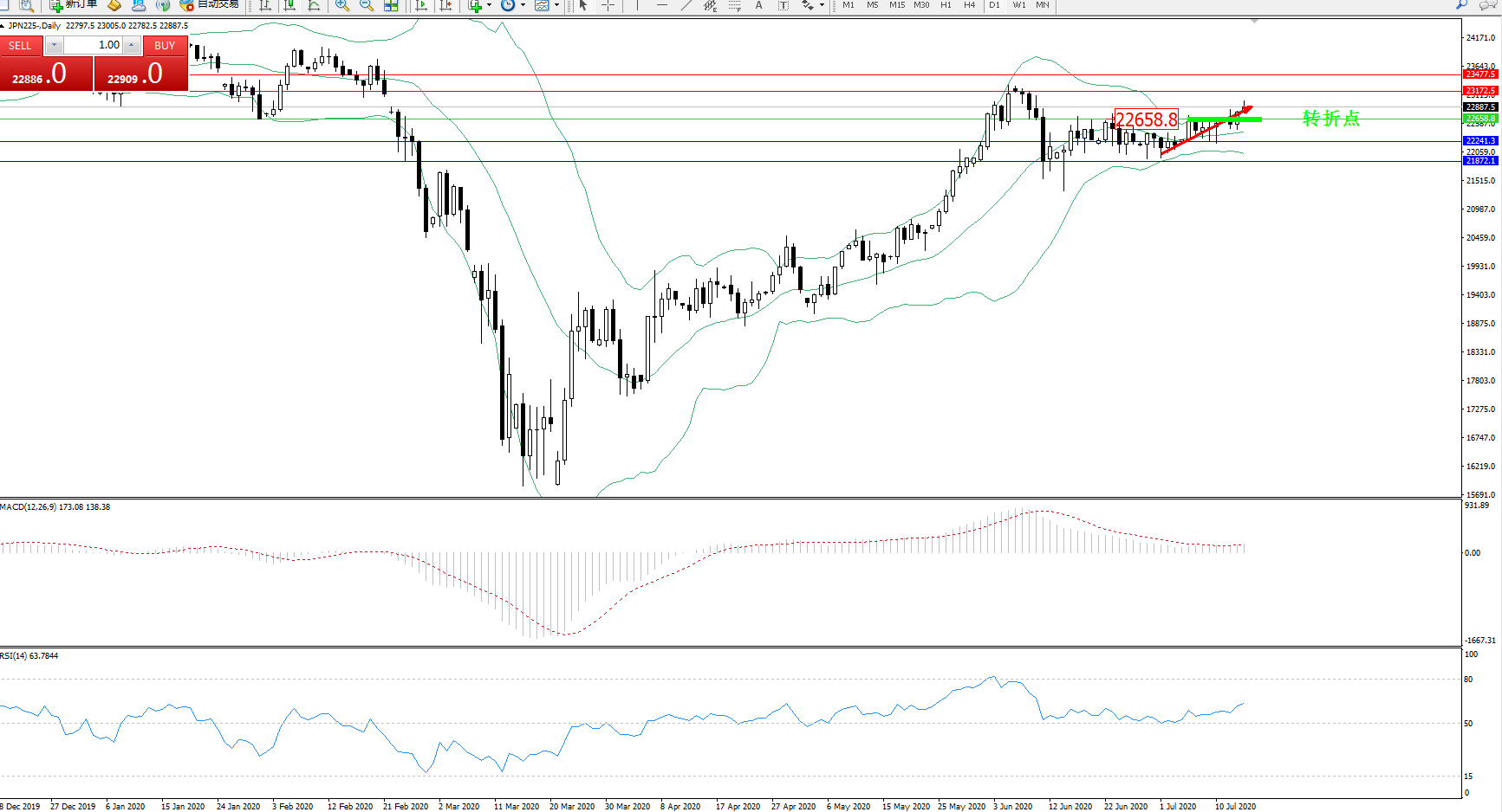 日经225指数7月15日(周三)收盘上涨342.99点,涨幅1.52%,报22930.00点。日本央行决定维持主要货币政策工具不变,符合市场预期,但日本存经济风险,通胀前景偏向下跌,由于疫情导致销售下滑,企业资金面临压力。此外日本东京将疫情警戒提升至最高级别,但日本央行表示经济正处于极其严峻的形势,且下调了今年及后年的经济增速预期,据日本共同社报道,东京都政府15日决定,将有关新冠肺炎疫情的4个阶段指标上调至最高级别。近期东京疫情出现反弹,从本月9日到14日,东京单日新增新冠肺炎确诊病例已经连续6天超过100人。