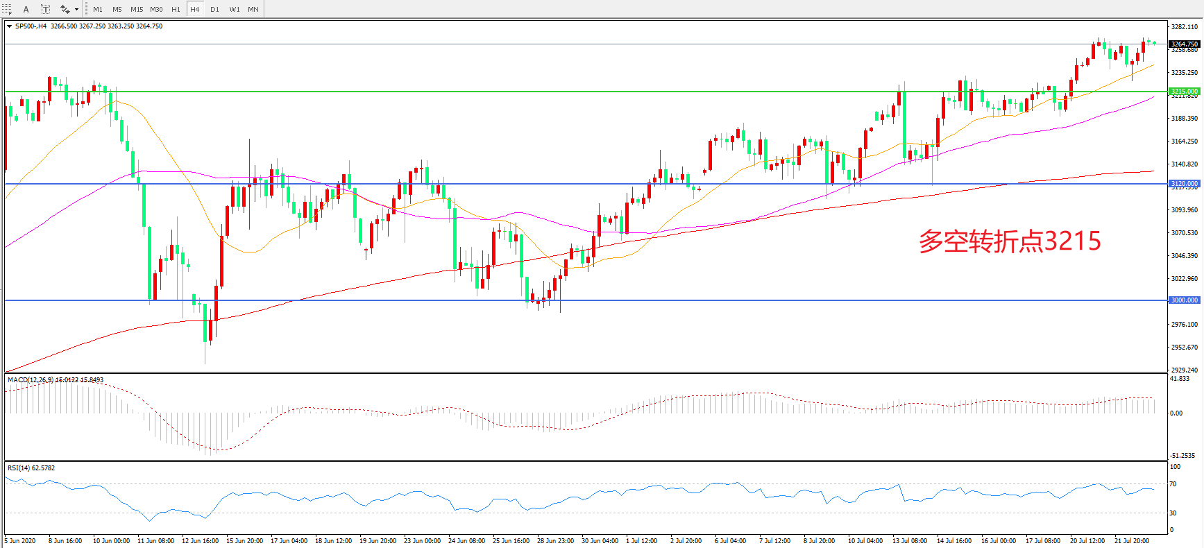 周三(7月22日),国际地缘政治风险、企业财报以及美国国会就新一轮财政刺激政策进行的谈判牵动市场人心,标普500延续震荡上行,收报3267点。目前白宫和参议院共和党的谈判陷入僵局,共和党的刺激经济方案规模为1万亿美元,民主党的方案规模为3万亿美元,两者相去甚远,分歧巨大。