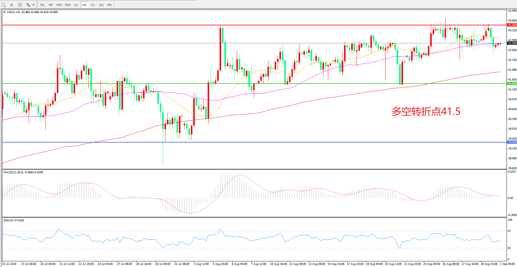 周一(8月31日),原油市场经历了动荡的一天,亚盘的走势仿佛给人一种想要突破的迹象,但是伴随着晚间美股的回落,美国WTI原油震荡下行,收报42.82美元/桶。在供应过剩的市场环境下,需求难以恢复到疫情前水平,而美股的短期高位风险也给市场带来了较大的不确定性。