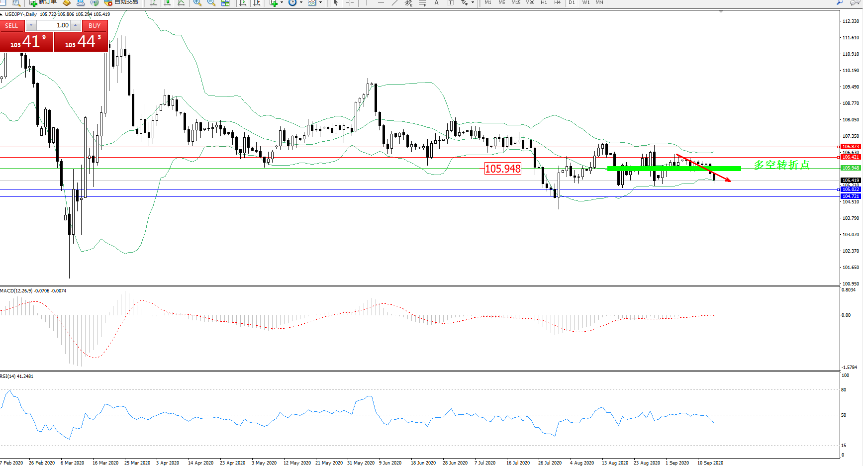 美元兑日元下跌0.27%至105.44;稍早跌至两周低点105.30,因市场预期受冠状病毒疫情影响,美联储将维持对美国经济的悲观看法,并将在一段时间内将美国利率维持在近零水准。在美联储新一轮政策决议来临前,美元指数再度面临下行压力,在日本自民党选出新党首后,越来越多投资者押注新首相菅义伟可能提前举行大选,以确保此后能有比较稳定的任期,来避免政府持续更迭,这却增加了短期政治前景的不确定性,令日元汇价因为避险需求而反而录得一波上涨。