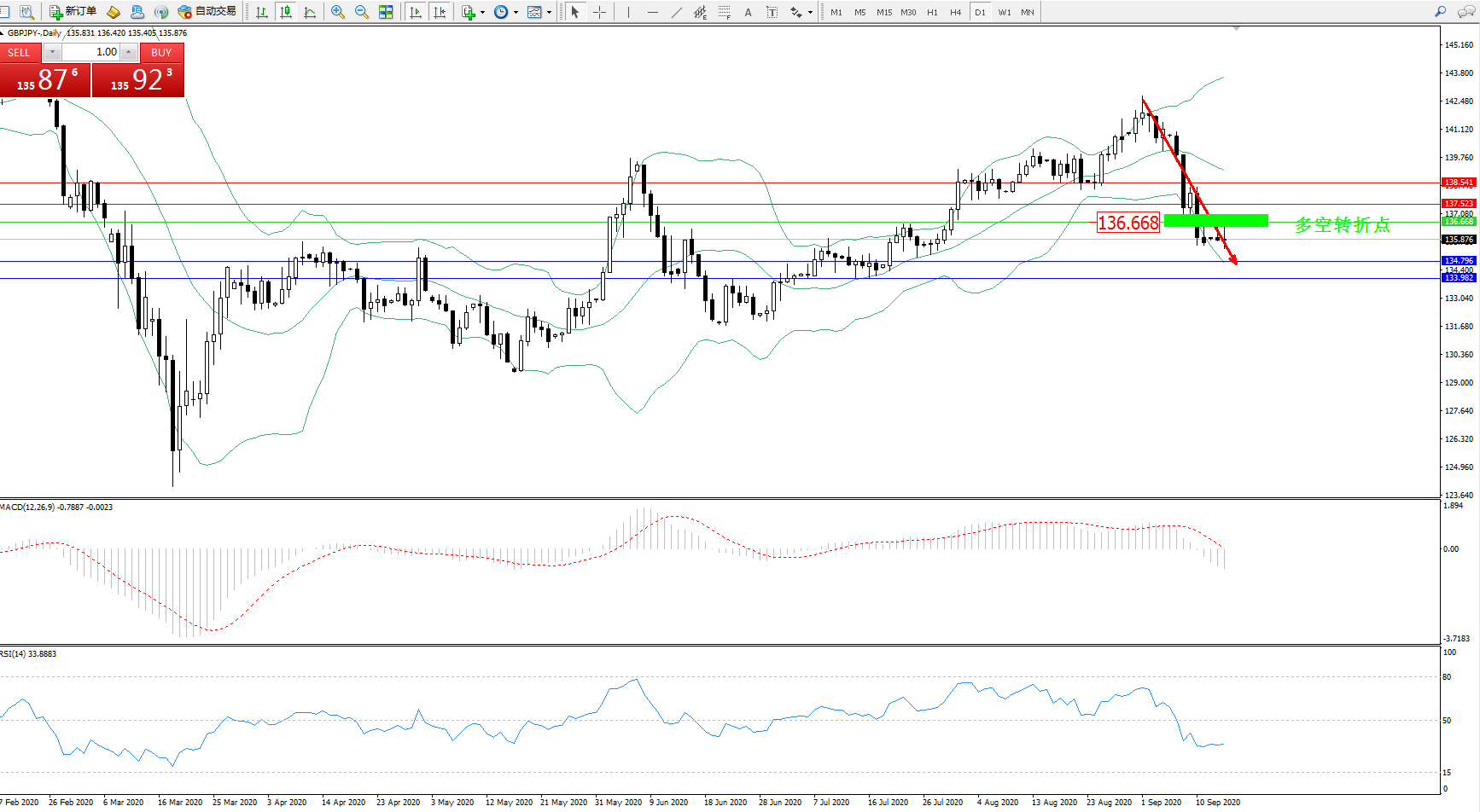 技术点评:高位空头动力急转直下,跌破布林带指标下轨后不断向下移动中,低位开始整理平移,布林带指标呈张口走势持续,低位或有短暂支撑,但空头下行态势良好,MACD指标处于多头区域高位持续宽幅整理平移后出现回撤下移至0轴线下方向下移动徘徊,RSI指标高位空头动力持续震荡下移破50均衡线进入空头区域持续下行后平移中;