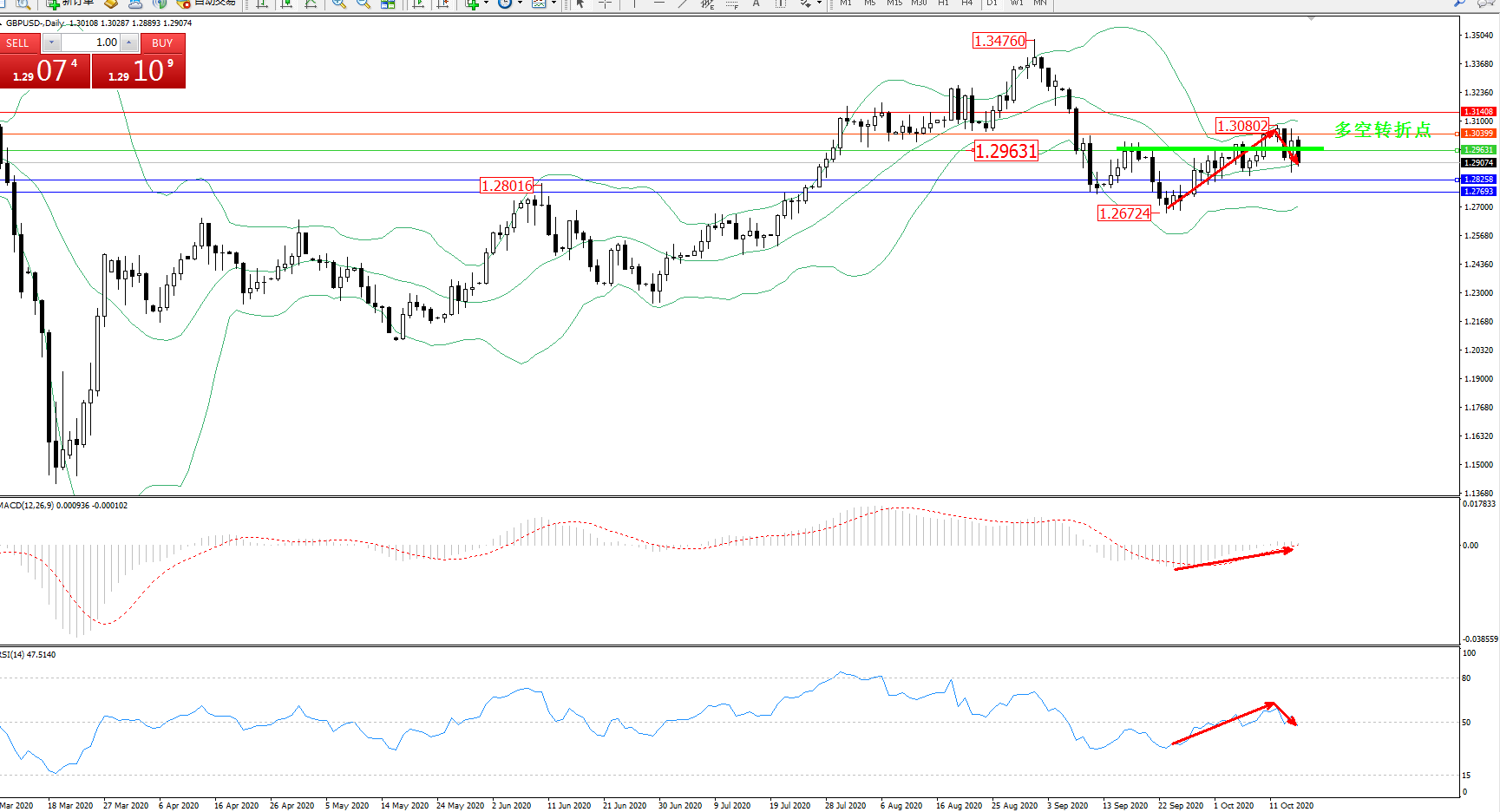 技术点评:低位多头动力长时间处于布林带指标通道内中上轨区间持续宽幅震荡向上移动中,高位低点1.30802位置后开始遇阻维持整理下行,即将跌破布林带指标中轨附近迹象,布林带指标呈张口走势后有收口走势迹象,MACD指标处于空头区域弱势整理缓慢回升至0轴线附近徘徊,RSI指标低位多头动力弱势整理回升至50均衡线附近持续徘徊中;