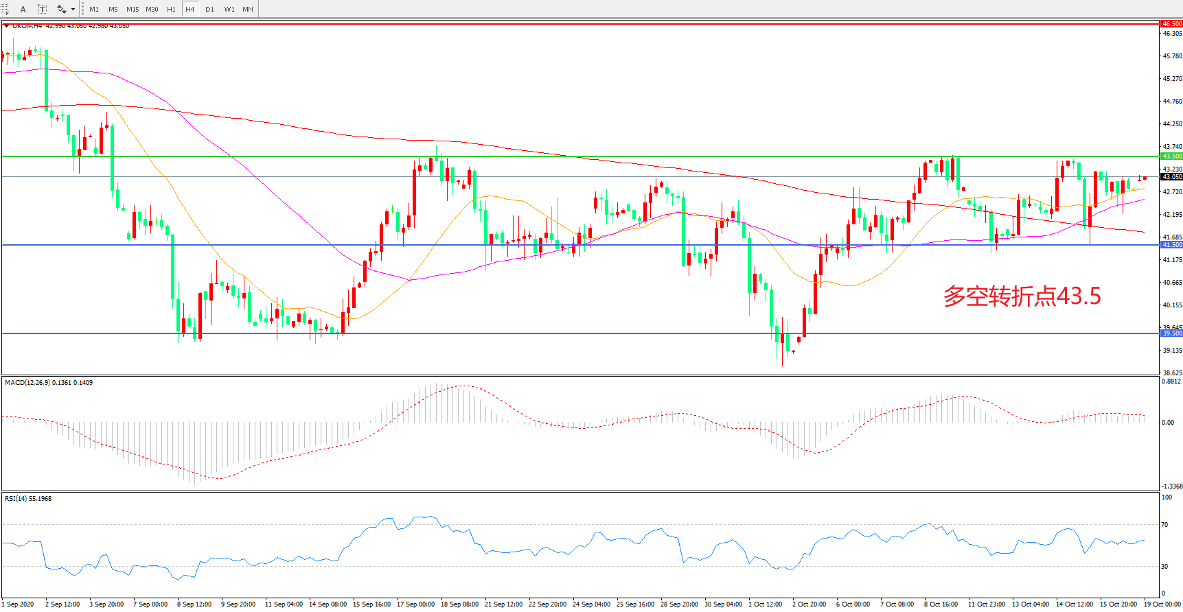 4小时图看,油价延续宽幅震荡,整体表现有所回暖,55均线成为短期支撑,43.5成为上方阻力,MACD红柱增加,RSI指标走平,日内延续震荡概率较大。