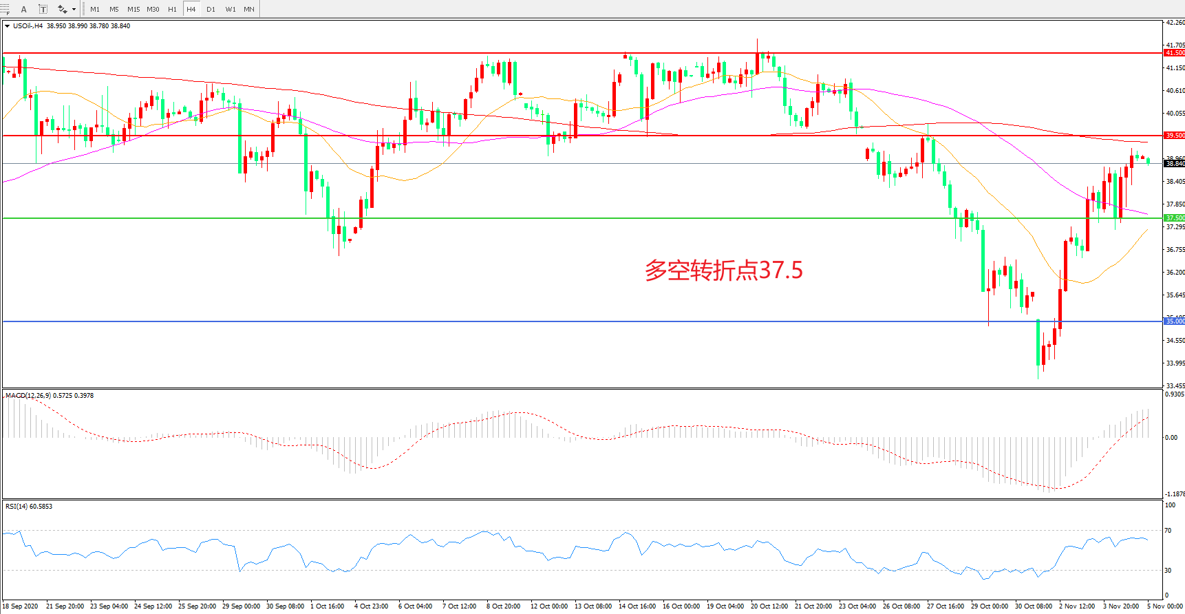 4小时图看,油价低位连续拉升,短期表现有所回暖,37.5美元成为下方支撑,200均线成为短期阻力,MACD红柱增加,RSI指标走平,日内延续上行概率较大。