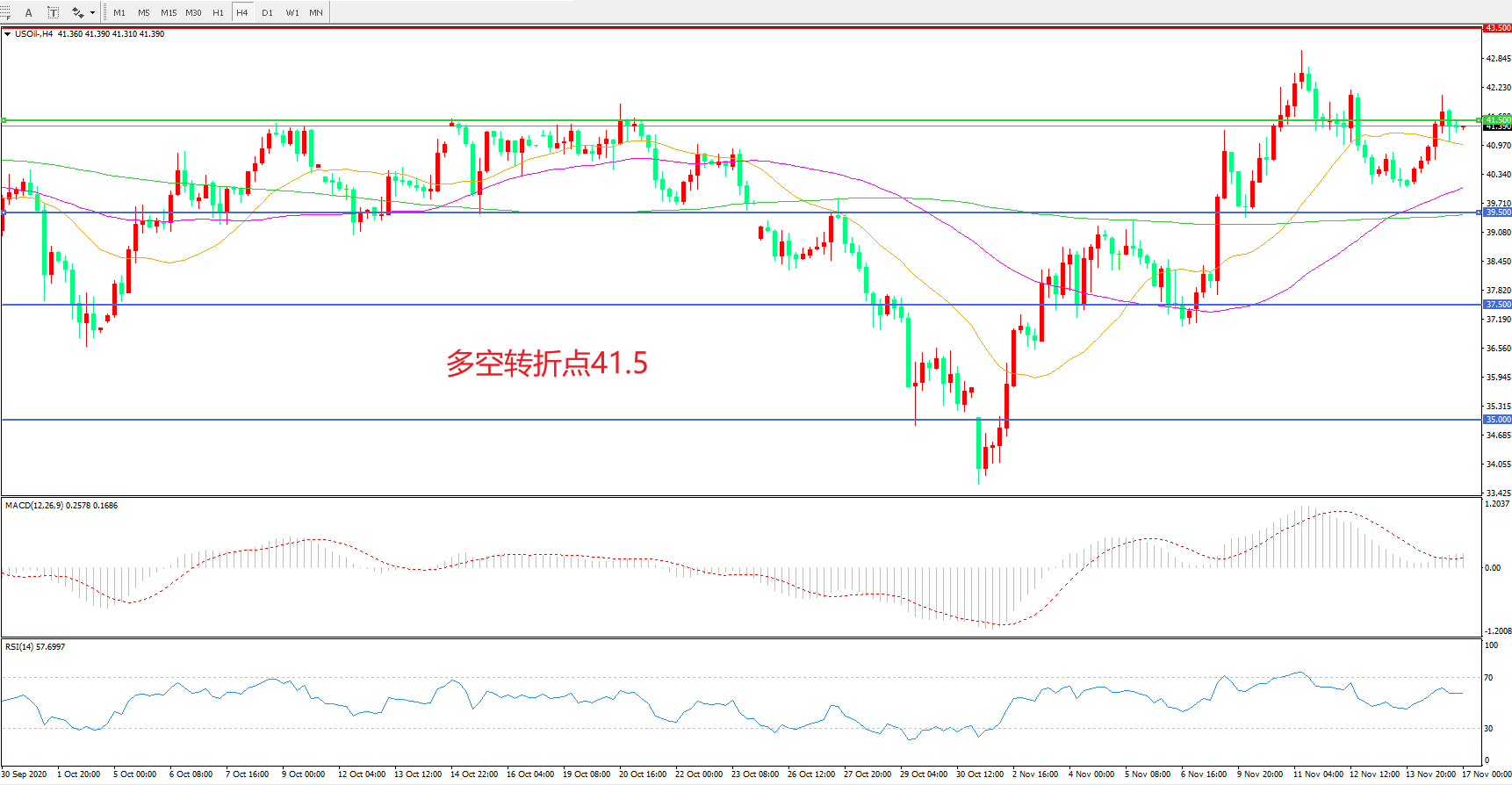 4小时图看,油价自低位震荡拉升,整体表现相对强势,41.5再次成为多空分水岭,21周期均线成为短期支撑,,MACD红柱增加,RSI指标走平,日内震荡上行概率较大。