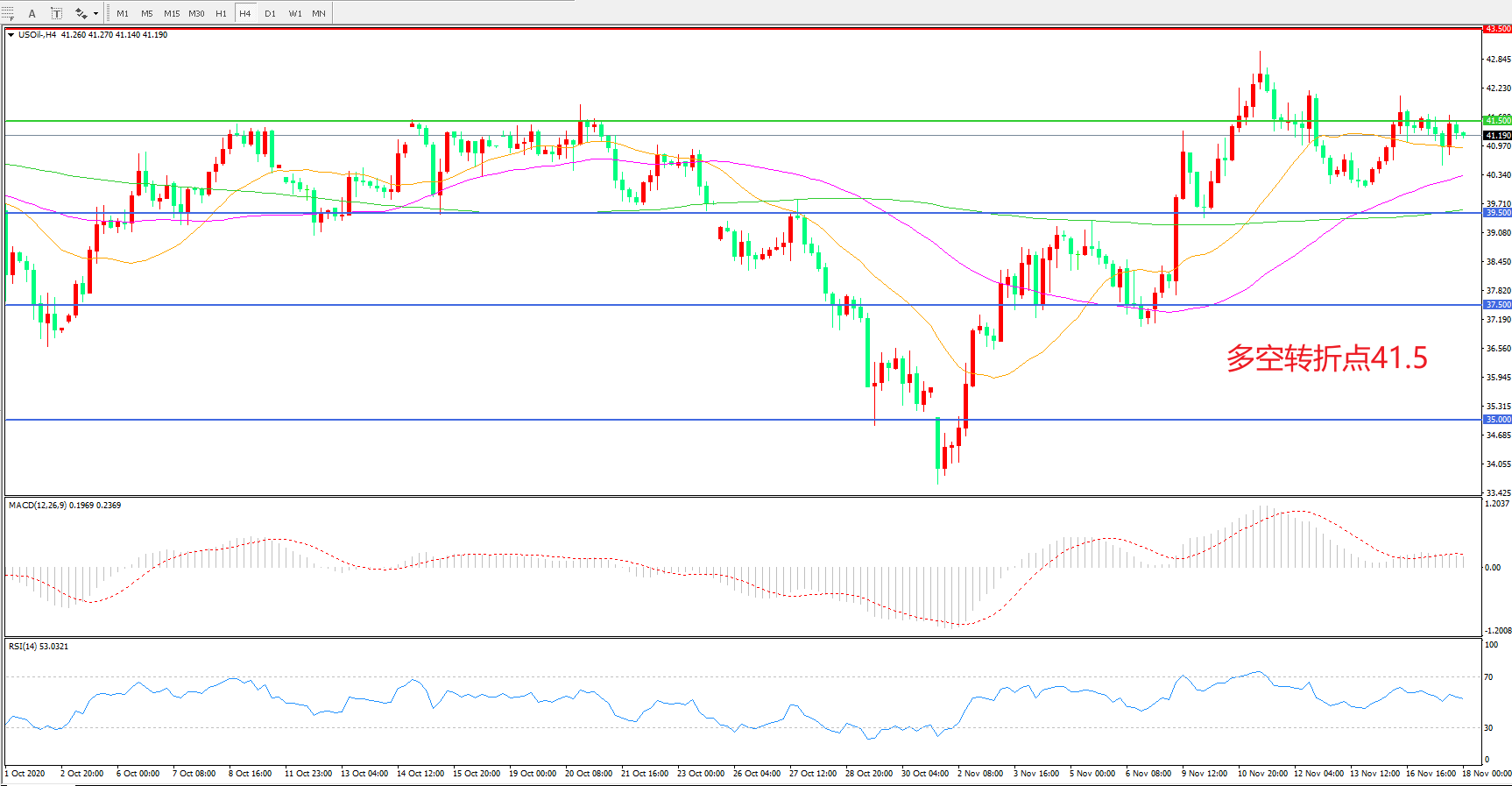 4小时图看,油价自低位连续拉升后,高位震荡迹象较为明显,41.5成为多空分水岭,21周期均线成为短期支撑,,MACD红柱增加,RSI指标走平,日内震荡上行概率较大。
