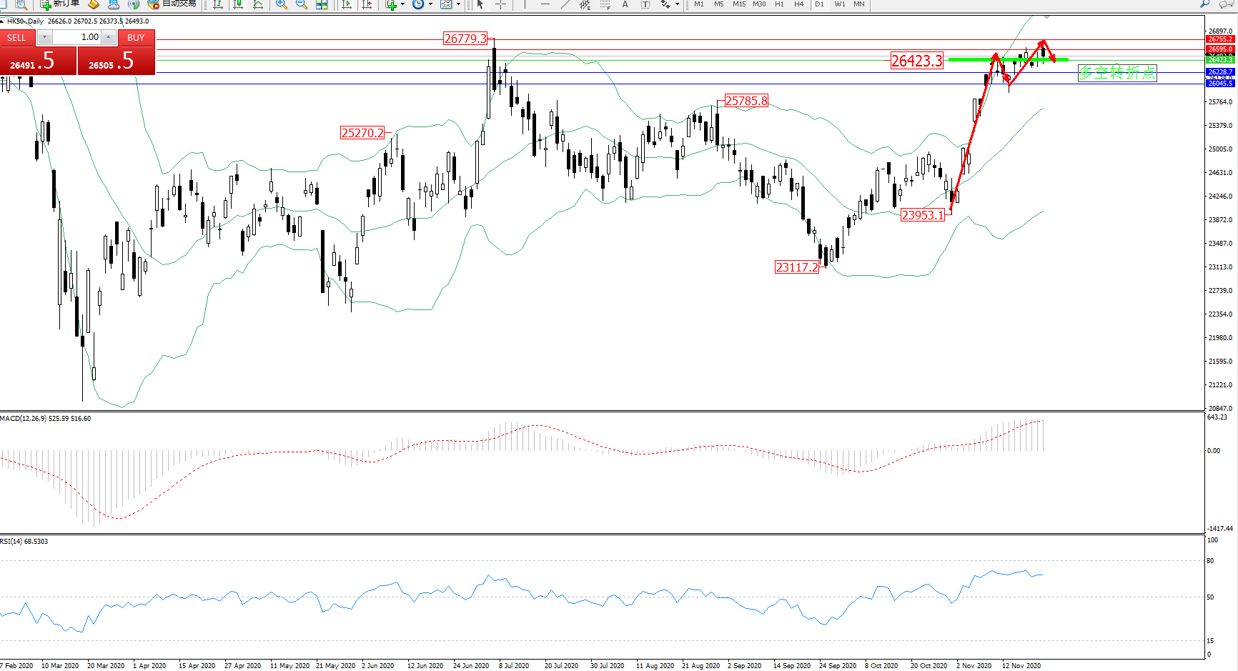 香港恒生指数11月23日(周一)收盘上涨34.66点,涨幅0.13%,报26486.20点;港股恒指收涨,恒生科技指数全日高位震荡涨1.14%。大型科技股小米大涨8%再创新高价,市值超6600亿港元,网易、阿里、京东、美团均上扬;石油、中资券商、煤炭表现活跃;疫情严峻致濠赌股、航空股大幅下跌,香港本地股、餐饮股皆下滑。今日南下资金净流入63.56亿港元,大市成交额为1520.38亿港元。香港新冠疫情反弹,据香港电台消息,香港特区卫生防护中心传染病处主任张竹君表示,11月23日新增新冠肺炎确诊案例73例,是继22日68例确诊病例后,再达超三个月(8月16日)以来单日新高。新冠肺炎疫苗有望短期内面世,港股市场当下估值水平在全球主流资本市场中最低,且在不断引进代表内地经济新方向的互联网、科技、医药龙头公司到香港上市,因此,维持对港股市场的乐观判断,香港市场依然是全球范围内性价比较好的投资选择。