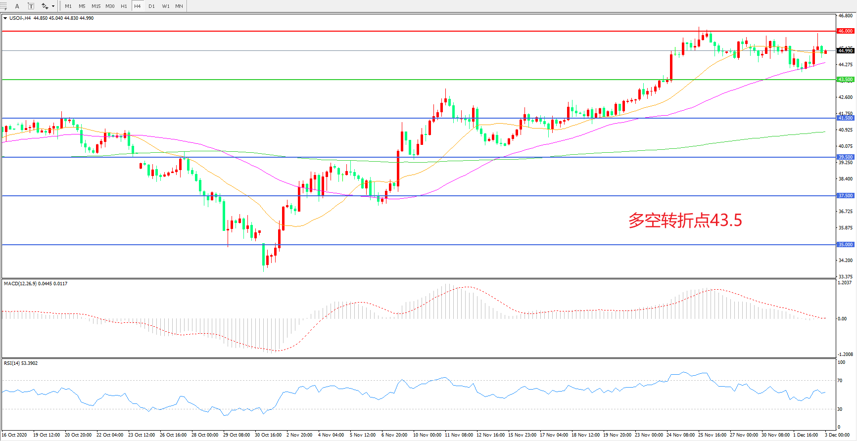 周三(12月2日),油价上涨受到新冠疫苗利好消息提振,以沙特和俄罗斯为首的 OPEC+联盟已经朝着达成新版石油产出协议取得进展,美国WTI原油小幅冲高,尾盘回落后收报44.94美元/桶。目前市场对全球经济前景的预期相对乐观,同时对美国财政刺激政策的乐观预期也支撑了油价。根据昨晚公布的EIA数据显示,美国EIA原油库存减少67.9万桶,差于预期,库存升幅远超预期,且精炼油库存变化值录得11个星期以来的首次增长。数据公布后,美油曾短线快速走低,但在乐观情绪的支撑下,油价依然保持着相对强势。