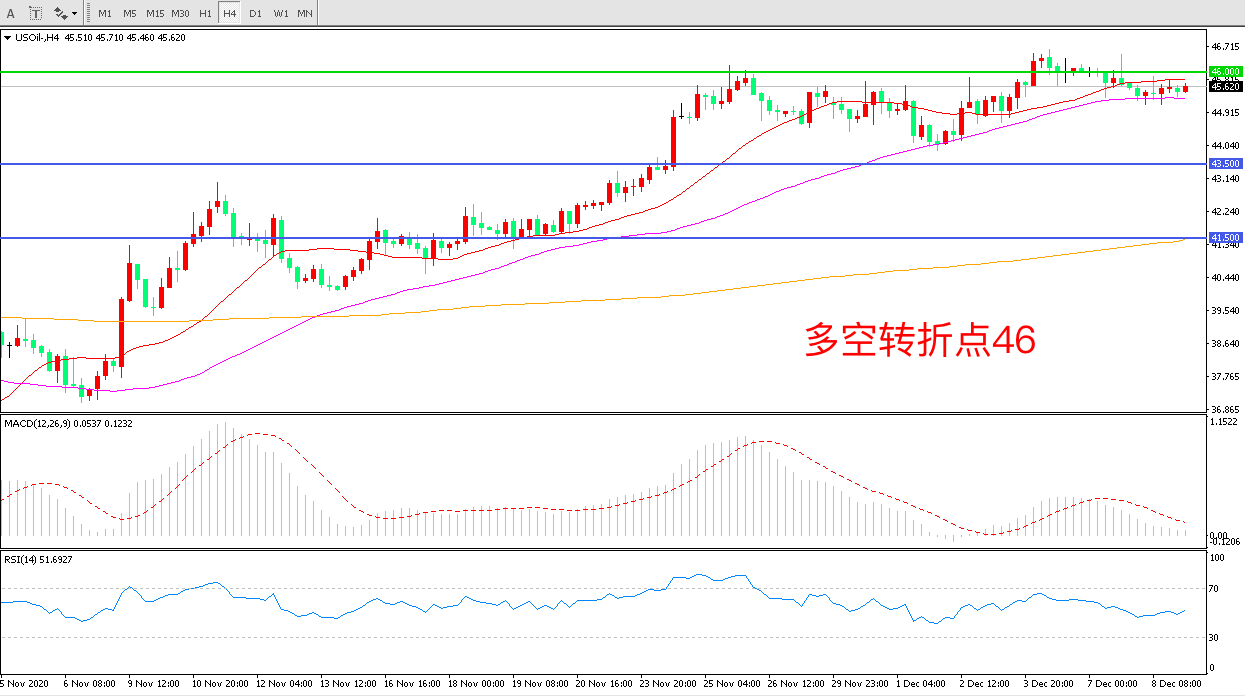 4小时图看,油价延续高位震荡,46美元成为多空分水岭55周期均线成为短期支撑MACD红柱减少,RSI指标走平,日内延续震荡概率较大。