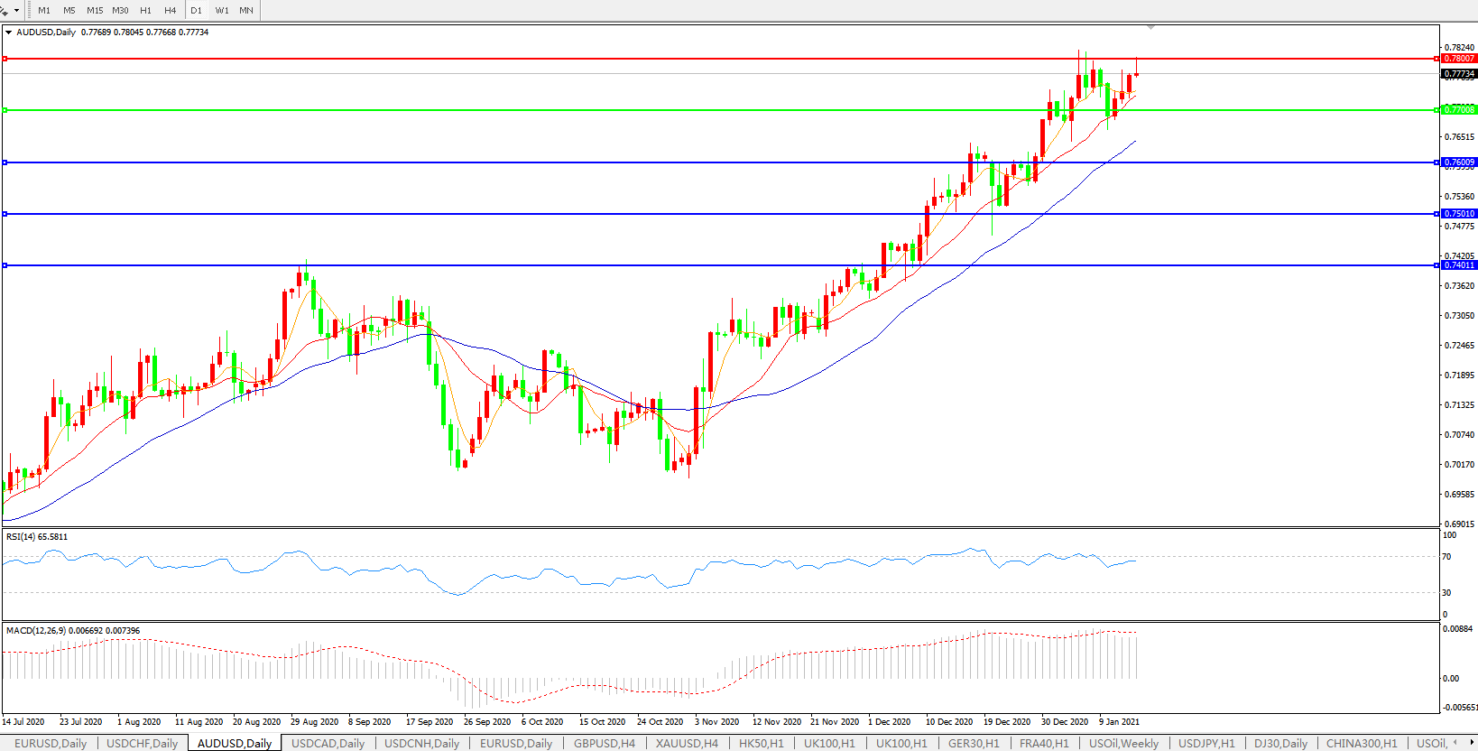 交易策略:0.7700上方看涨,目标0.7800、0.7900