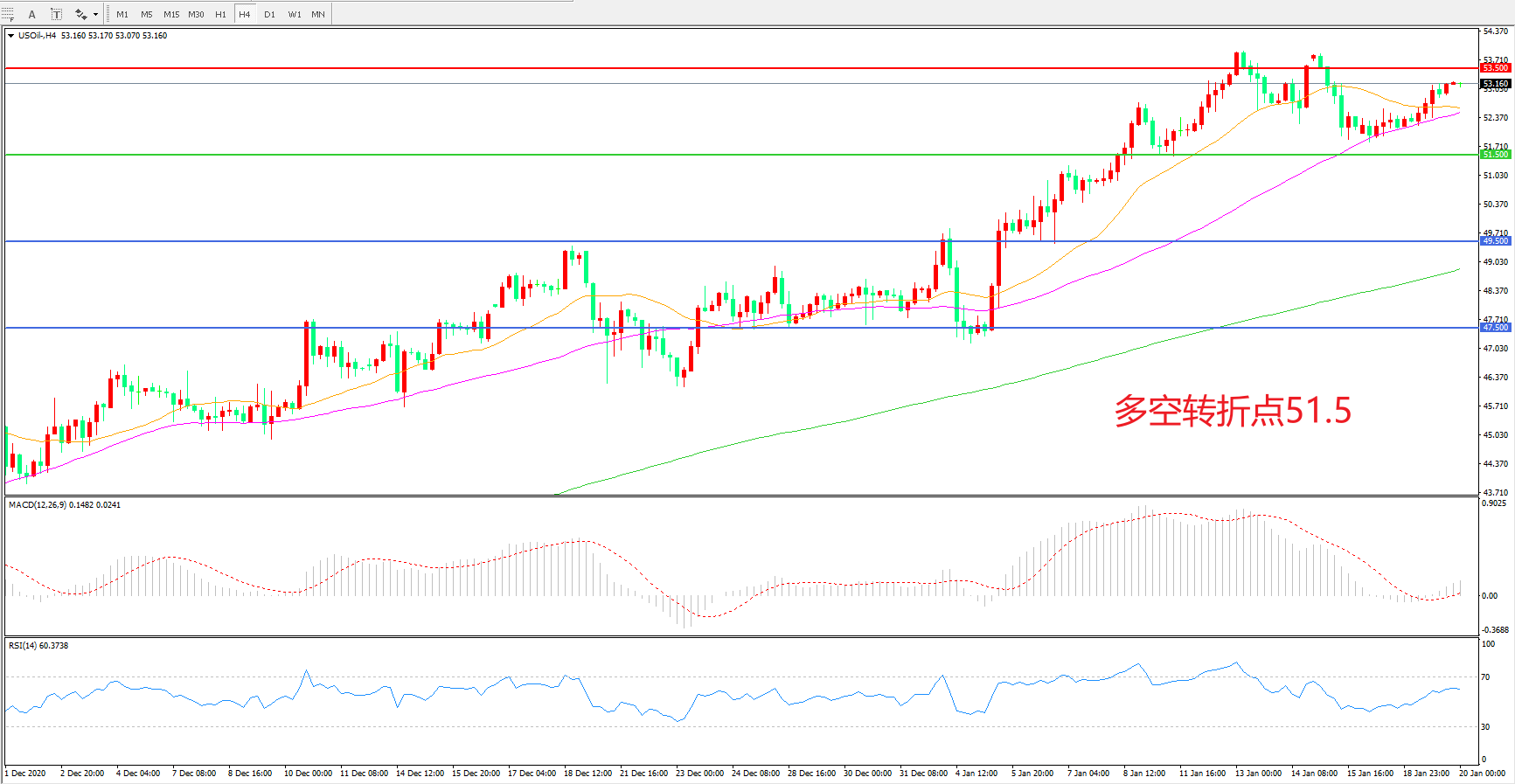周二(1月19日),拜登即将宣誓就职,耶伦发言支持更多财政刺激,通货膨胀交易回暖,美国WTI原油震荡反弹,收报53.16美元/桶。对于当前的原油价格来说,虽然昨天出现短暂回升,但我们仍要注意二次触顶的风险存在。现在的原油价格,基本面的影响因素相对次要,市场的焦点集中在宏观层面,尤其是美元走势的变动对金融市场的重要影响。