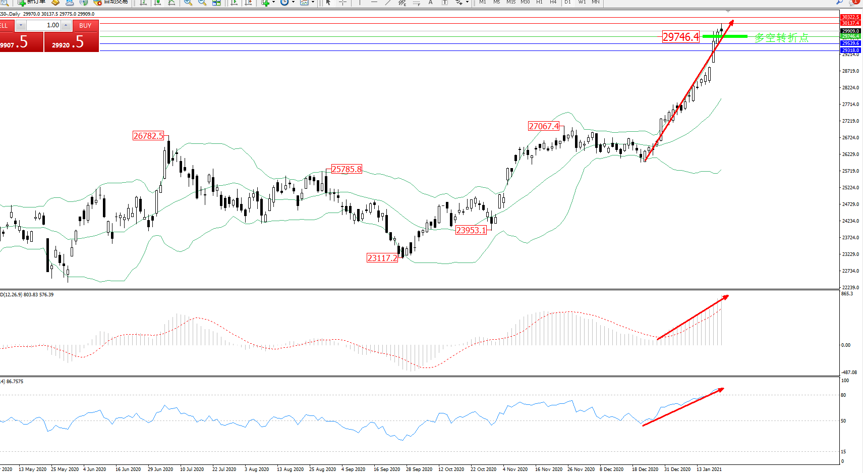 技术点评:多头动力延续布林带指标通道上轨附近持续震荡上扬态势良好,强势飙升后屡破新高,布林带指标呈张口走势持续中,多头动力未见其止步迹象,且有继续拉升上扬态势,MACD指标处于多头区域维持震荡上扬态势良好,RSI指标处于多头区域维持震荡上扬至80均衡线上方持续拉升中;