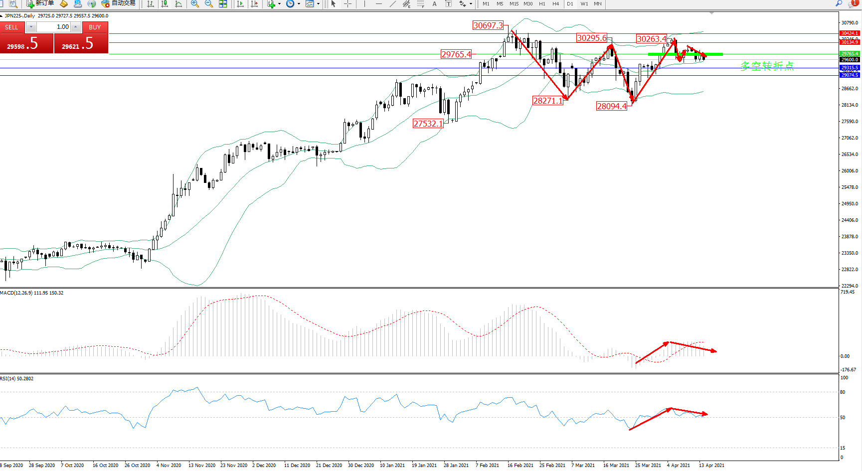 日经225指数4月14日(周三)收盘下跌105.61点,跌幅0.35%,报29646.00点。日本央行行长黑田东彦:日本经济形势严峻,但有好转的趋势。未来日本经济将继续改善。随着经济好转,物价将转为正,并加快增长步伐。经济面临风险,物价偏向下行。将继续通过宽松的政策寻求市场的稳定。将通过大力放松货币政策,努力支持企业融资和金融市场稳定。将耐心地继续宽松货币政策,实现2%的通胀目标。3月的政策调整提高了经济的可持续性和灵活性。