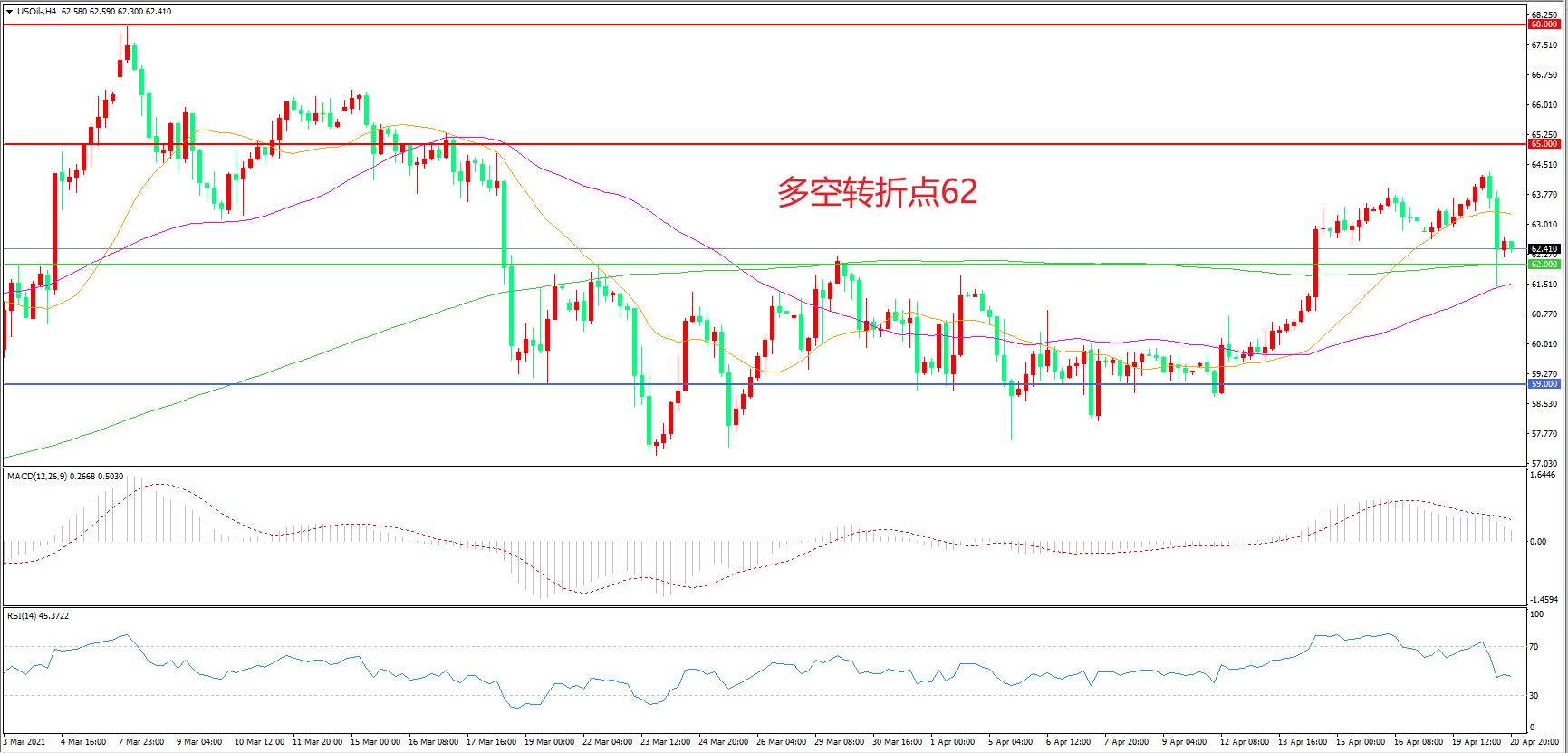 4小时图看,油价长阴破位,前期涨幅被吞噬殆,62美元成为上方阻力,62成为多空分水岭,MACD红柱缩短,RSI指标走平,日内延续震荡概率较大。