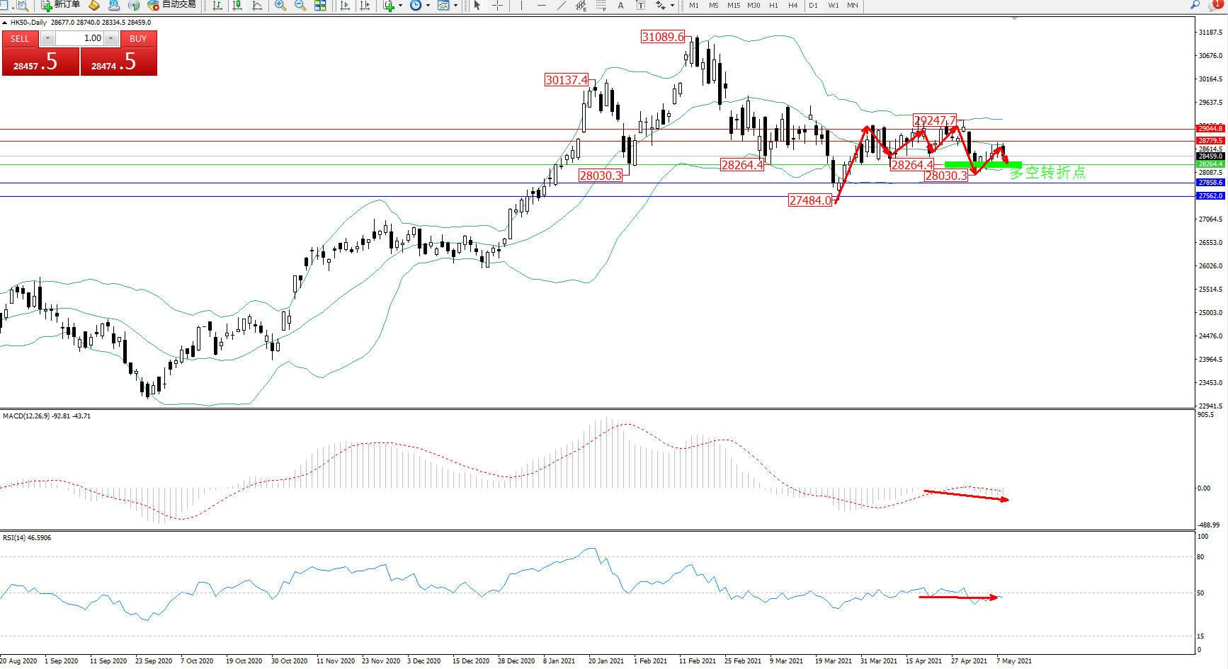 香港恒生指数5月10日(周一)收盘下跌14.99点,跌幅0.05%,报28595.66点;港股三大指数收跌,大型科技股拖累大市走弱,恒生科技指数跌0.86%报7886点。大型科技股美团大跌7%拖累恒指下挫近百点,医美概念股领涨,大宗商品市场行情火热,复星医药飙升25%再创历史新高。大市成交额为1635亿港元,南下资金净流出32.65亿港元。南向资金日净卖出港股64.68亿港元,其中沪市港股通净卖出19.25亿港元,深市港股通净卖出45.43亿港元。净卖出前三个股为美团-W、腾讯控股、复星医药,分别遭净卖出37.55亿港元、13.37亿港元、4亿港元。中国海洋石油、小米集团-W、李宁净买入额位列前三,分别获净买入6.01亿港元、4.38亿港元、1.98亿港元。恒生指数公司公告称,易方达等8支追踪恒生科技指数的内地基金产品已于近日获中国证券监督管理委员会批准发行。截至2021年4月底,全球共有13只与恒生科技指数挂钩的交易所买卖产品,于5个不同交易所上市,资产管理总值约30亿美元。