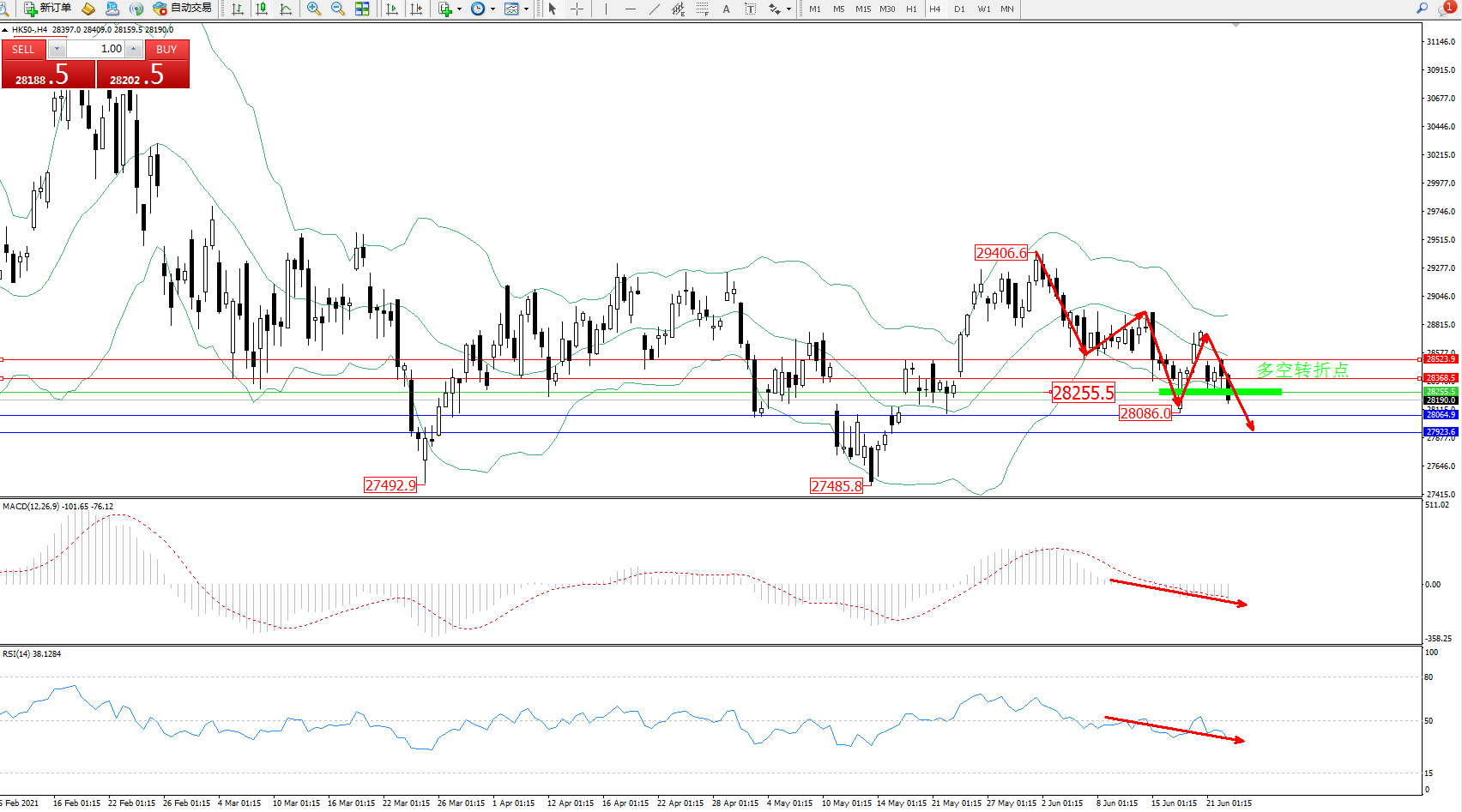 香港恒生指数6月22日(周二)收盘下跌179.24点,跌幅0.63%,报28309.76点;港股主要指数全线收跌,三大指数尾盘跌幅进一步扩大。恒生科技指数跌1.81%报7812点。大型科技股全线下挫,拖累大市下跌。美团、腾讯、小米均跌超2%,三者拖累恒指下挫超150点;另一方面,医疗设备股逆势爆发,春立医疗、爱康医疗均大幅收涨超30%;教育股反弹,石油股继续活跃。今日大市成交额为1413亿港元,南下资金逆势净流入27.41亿港元。香港政府统计处公布,根据综合消费物价指数,今年5月份整体消费物价按年上升1%,较4月份的相应升幅0.8%为高,为今年1月以来最高,但仍低于市场预测的1.1%的升幅。剔除所有政府一次性纾困措施的影响,综合消费物价指数在5月份的按年升幅(即基本通胀率)为0.2%,较4月份(0.1%)稍高,主要是由于外出用膳及外卖费用升幅扩大和新鲜蔬菜价格跌幅收窄所致。