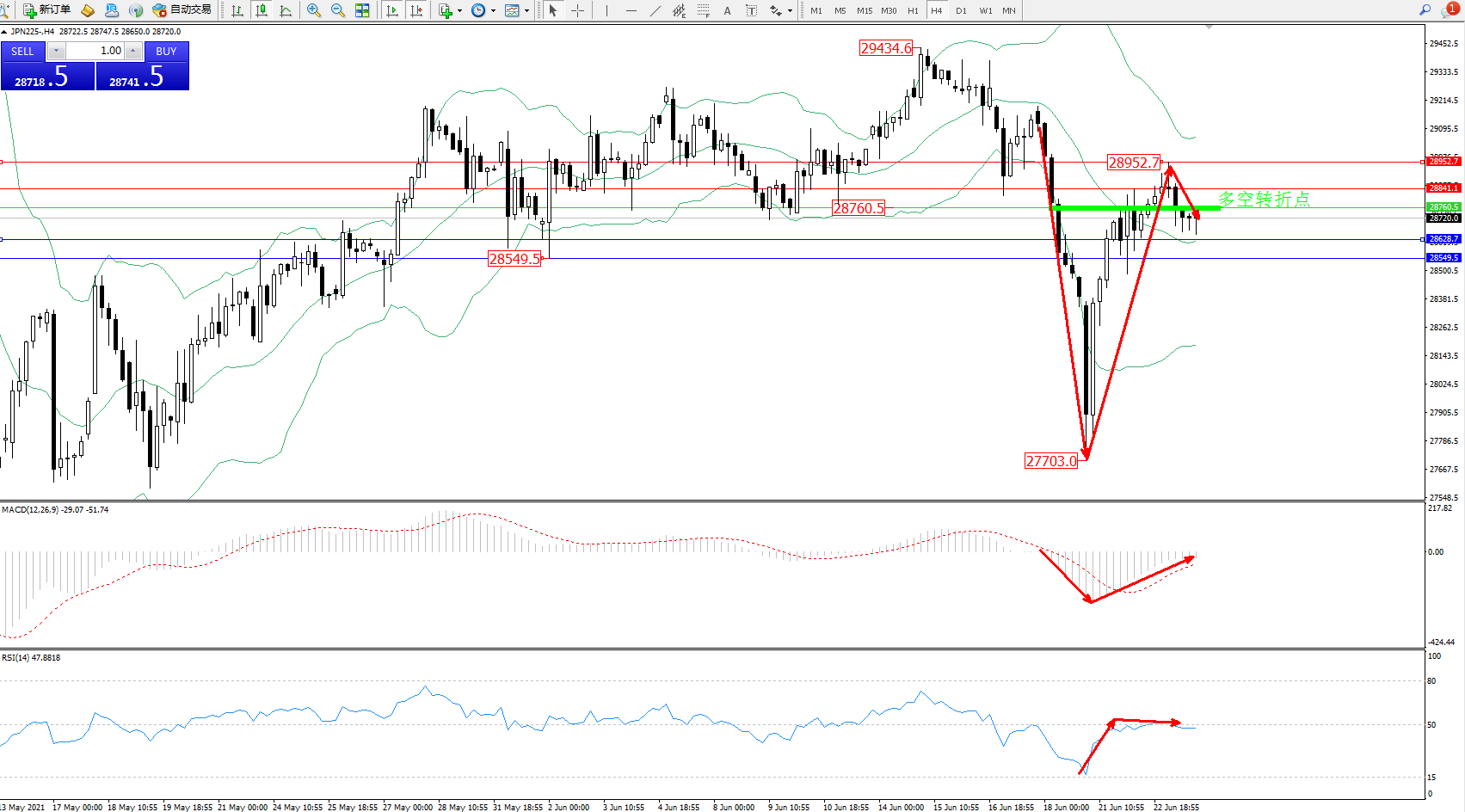 技术点评:空头动力延续布林带指标下轨持续下挫,跌至27703位置后开始呈V型反转上扬,强势回升至28952位置后震荡,布林带指标呈收口走势后开始平移中,MACD指标处于0轴线下方空头区域维持弱势窄幅整理中,RSI指标处于50均衡线附近窄幅徘徊中;
