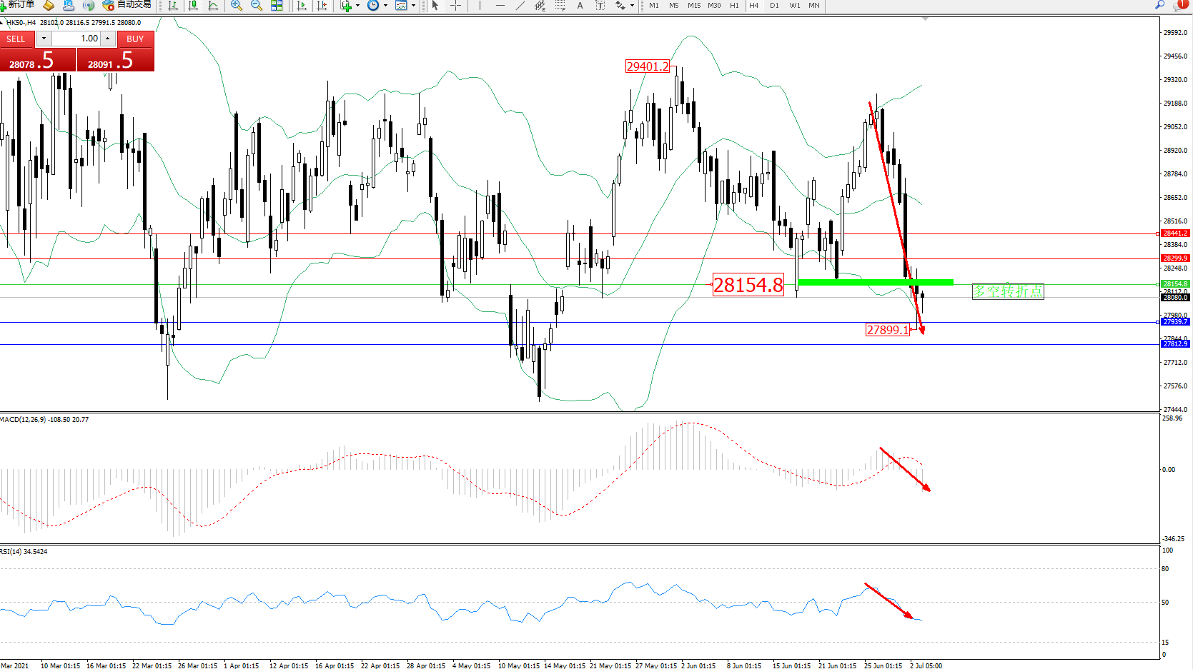 技术点评:高位空头动力急速下挫,跌破布林带指标下轨附近节点后短暂震荡回升,纠结于下轨内侧附近震荡中,空头动力有进一步向下移动态势,布林带指标呈张口走势持续中,MACD指标空头动力跌破0轴线进入空头区域持续下行,RSI指标空头动力震荡下行破50均衡线进入空头区域持续整理向下移动中;