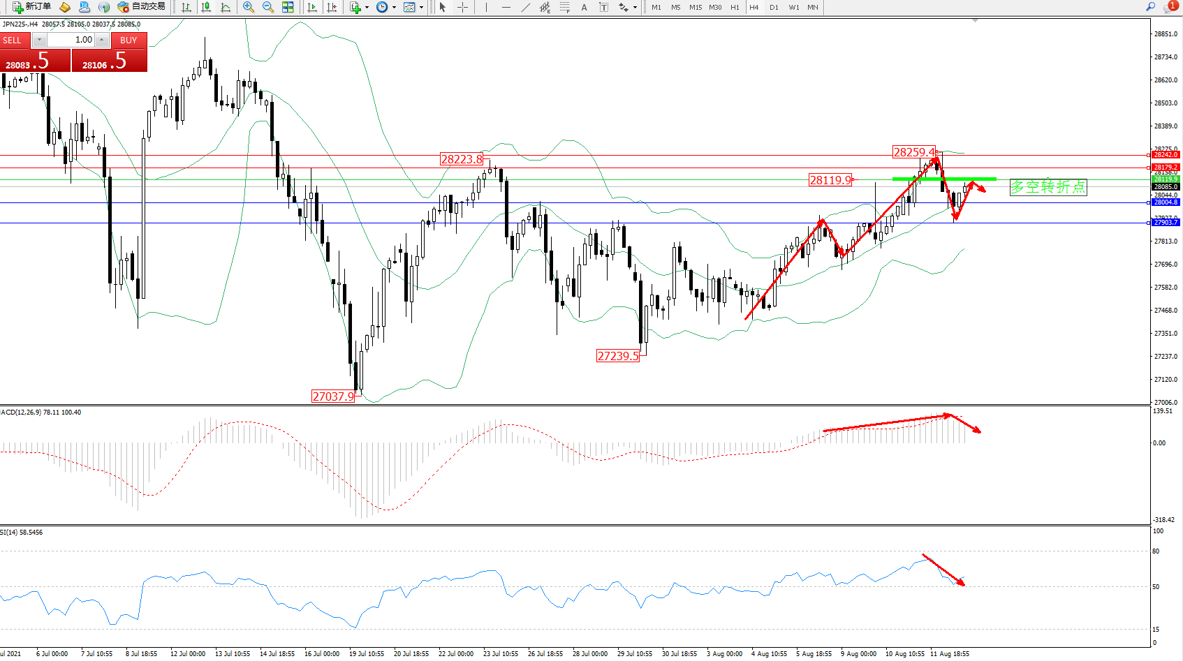 技术点评:多头动力延续布林带指标提供的中上轨区间持续震荡上扬,高位抵达28259位置后遇阻回撤,纠结于中轨附近震荡上移,上行趋势虽好,但上方压制依旧存在,布林带指标呈收口走势中,MACD指标处于多头区域整理平移,RSI指标处于多头区域震荡回撤,即将触及50均衡线后整理;