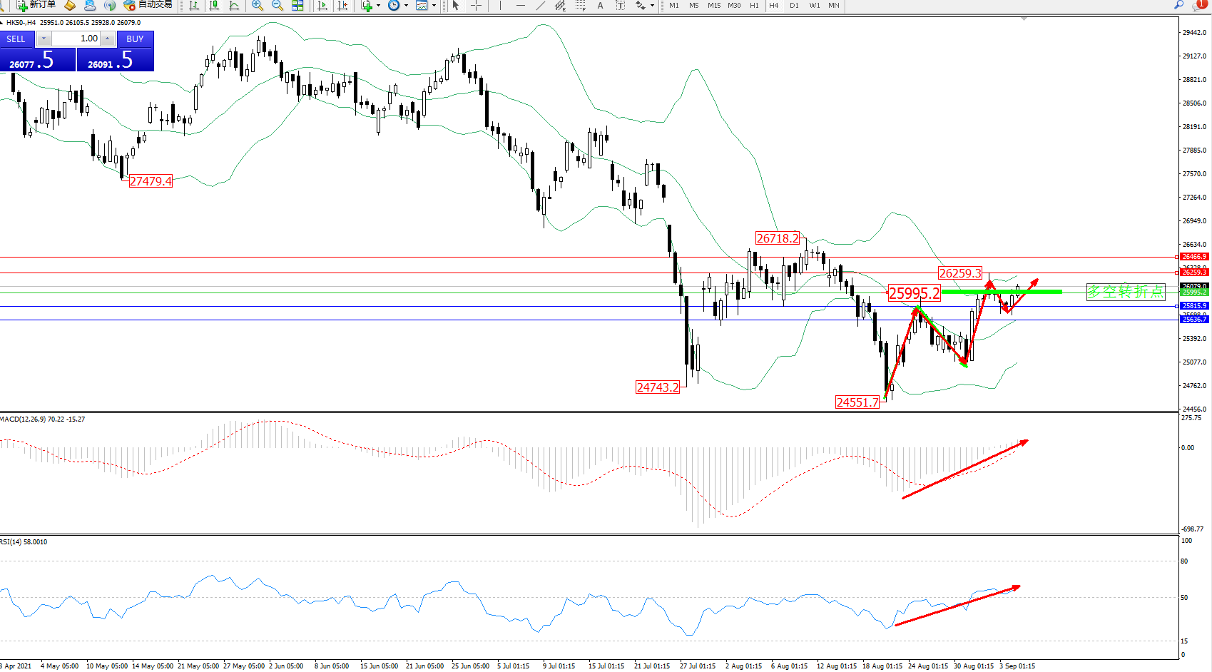 技术点评:低位多头动力维持震荡向上移动,高位抵达26259位置后短暂调整,多头动力有进一步向上移动态势,布林带指标呈收口向上移动中,MACD指标处于多头区域维持震荡向上移动至0轴线上方弱势徘徊,RSI指标处于50均衡线上方窄幅整理中;