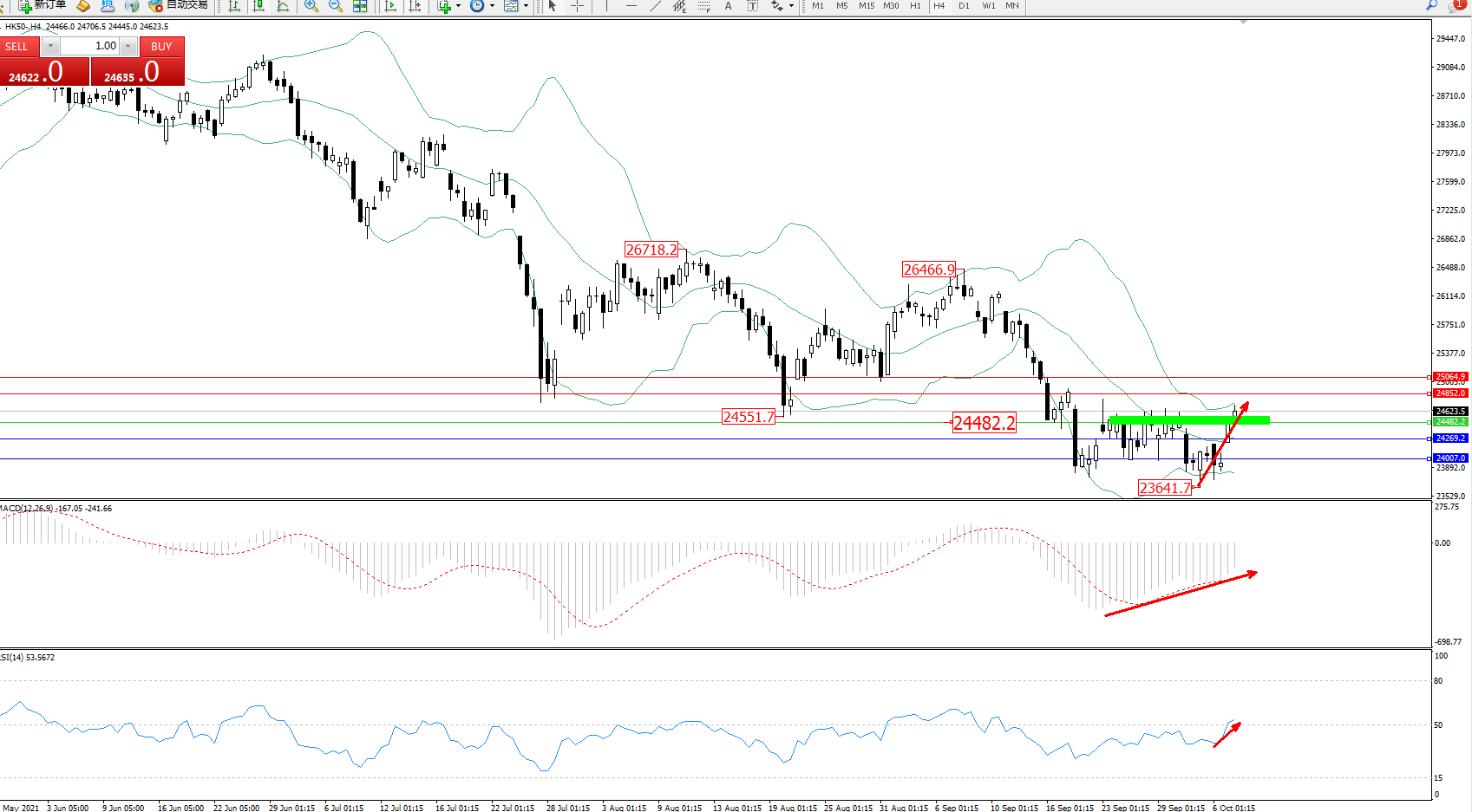 技术点评:长时间维持低位窄幅整理后,低位抵达23641位置得到支撑拉升上扬,触及布林带指标上轨附近节点后有继续攀升迹象,布林带指标呈收口走势后开始有张口迹象,MACD指标处于空头区域维持震荡缓慢上移中,RSI指标处于空头区域维持整理后强势拉升突破50均衡线进入多头区域徘徊;