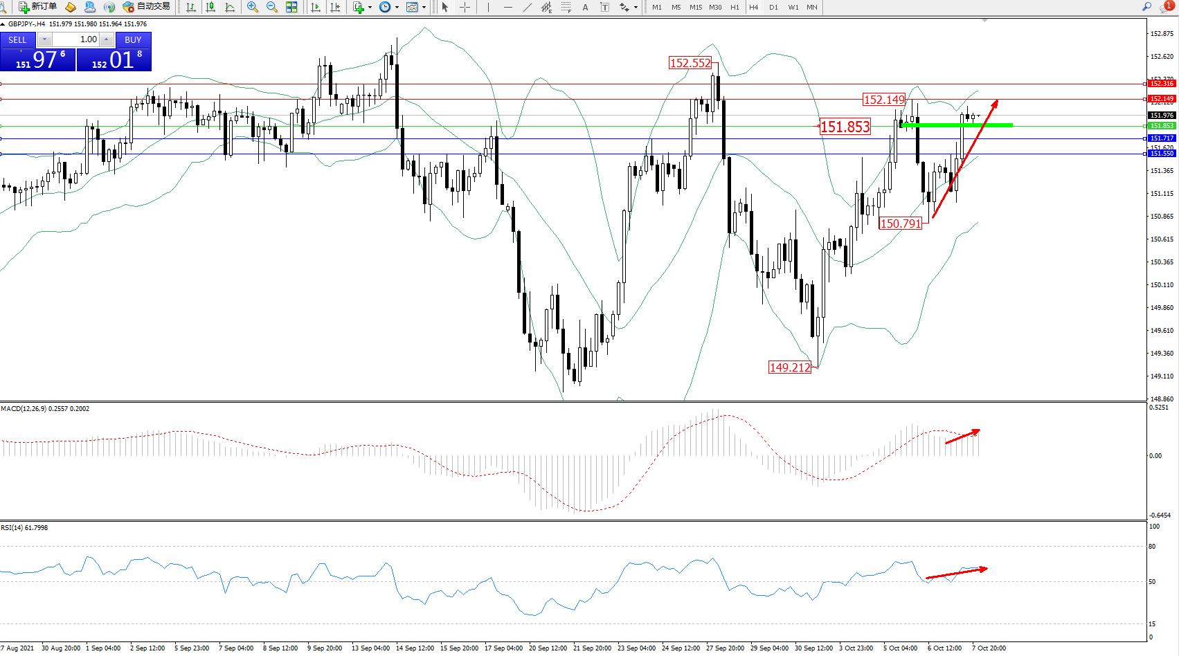 交易策略:151.853上方看涨,目标152.149、152.316