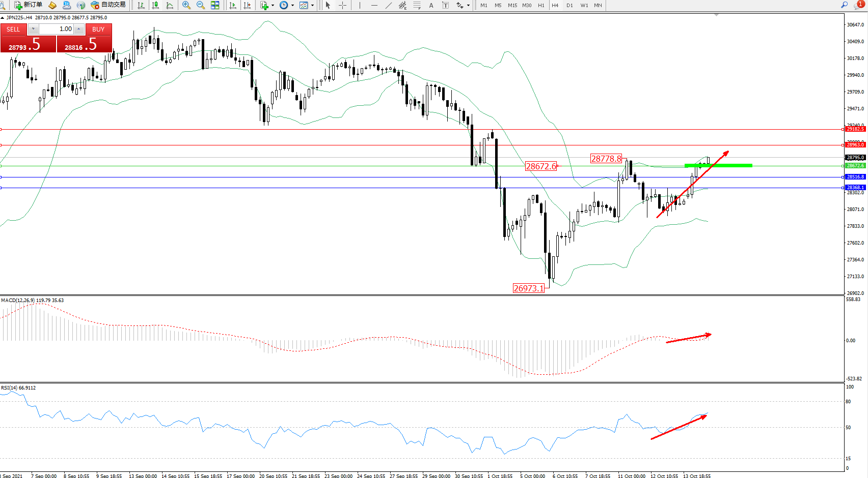 日经225指数10月14日(周四)收盘上涨423.72点,涨幅1.51%,报28564.00点。日本央行委员野口旭:如果疫情结束,将逐步退出有关应对疫情而采取的措施。在退出疫情支持措施方面须谨慎。只要还有另一波疫情传播的风险,日本央行就必须维持疫情纾困放款计划。日本央行突然结束疫情支持措施可能会引发经济冲击。当退出疫情支持措施时,必须确保其不会妨碍日本央行实现2%的通胀目标。除非日本经济能明显恢复到疫情前的状态,否则日本央行除了延长疫情支持措施之外可能别无选择。如果商品价格持续上涨,可能会损害利润。原材料价格上涨使日本的贸易条件恶化,但企业利润仍然强劲。