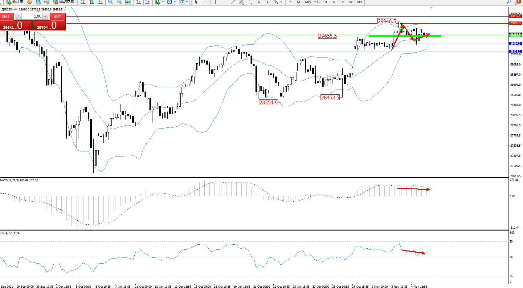 日经225指数11月5日(周五)收盘下跌189.87点,跌幅0.64%,报29604.50点。日本定于本月10日召开特别国会,进行首相指名选举。由于在10月31日举行的日本第49届众议院选举中自民党和公明党的执政联盟获得胜利,岸田文雄将被选举为日本第101任首相。