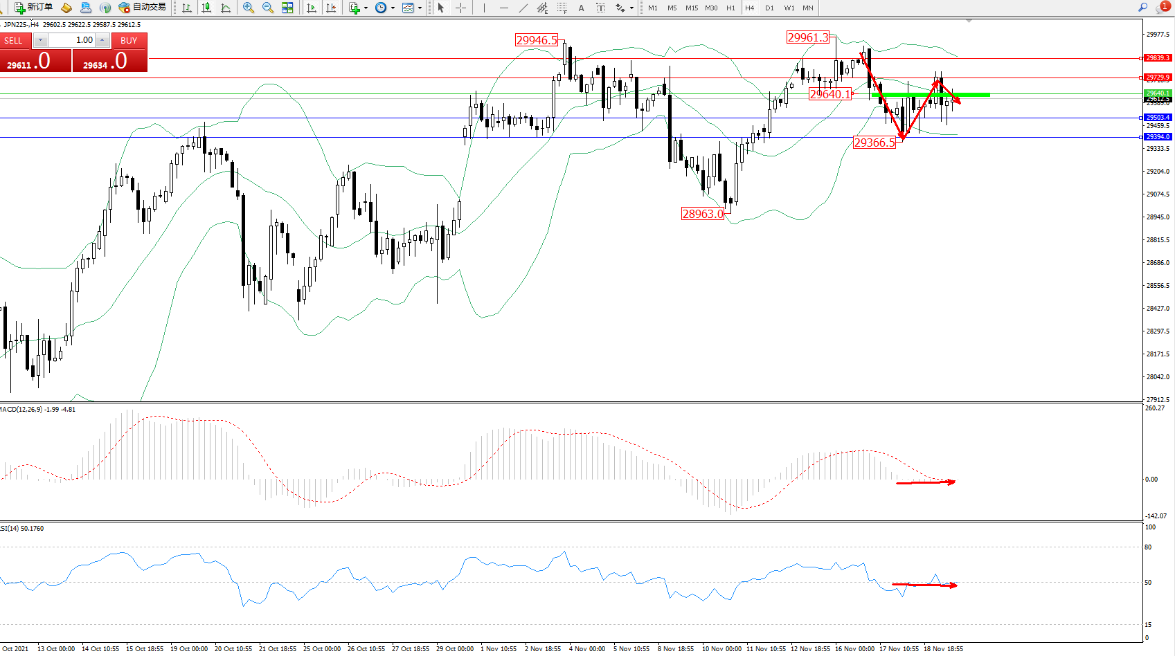 日经225指数11月19日(周五)收盘上涨161.34点,涨幅0.55%,报29760.00点。日本首相岸田文雄:希望吸引更多芯片制造商。将讨论基于新资本主义的资本利得税。为刺激经济,将动用所有的融资选择。初级平衡目标如有必要需重新评估,希望薪资上涨,日本央行的政策将提振经济,日本政府将通过创造增长和分配的良性循环,寻求可持续地提高工资,具体政策措施由日本央行决定,没有考虑调整日本现行的销售税税率,将在2022年3月本财政年度结束前分析疫情对日本经济的影响,评估实现基本平衡目标的时机,将采取包括发行新债在内的各种手段为刺激经济提供资金,预计经济刺激将使GDP增长约5.6% 。