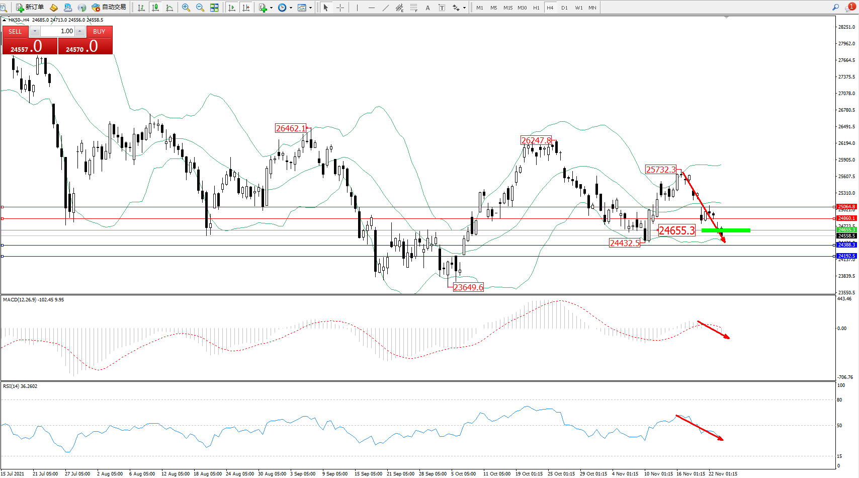 技术点评:空头动力持续震荡下行,即将触及布林带指标下轨附近节点,短期跌势或将延续,布林带指标呈收口走势持续平移中,前期低位24432位置近在咫尺破位在即,MACD指标处于0轴线下方空头区域维持弱势下行,RSI指标处于50均衡线下方维持震荡持续下探;