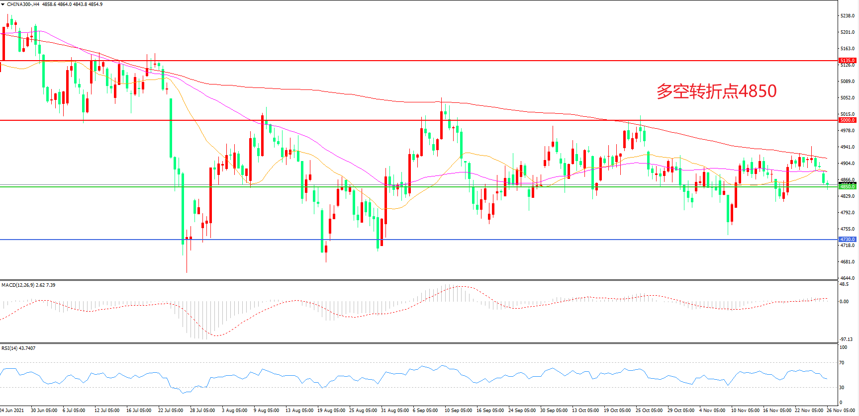 4小时图看,沪深300高位震荡,短期走势低迷,均线系统成为阻力,4850成为多空分水岭,MACD红柱缩短,RSI指标走平,日内延续震荡概率较大。