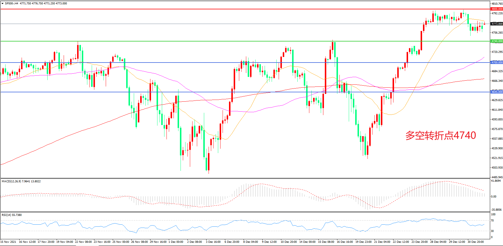 4小时图看,标普500受制于4800一线阻力,短线走势陷入震荡,均线系统逐渐走平, MACD红柱缩短,RSI指标走平,日内延续震荡概率较大。
