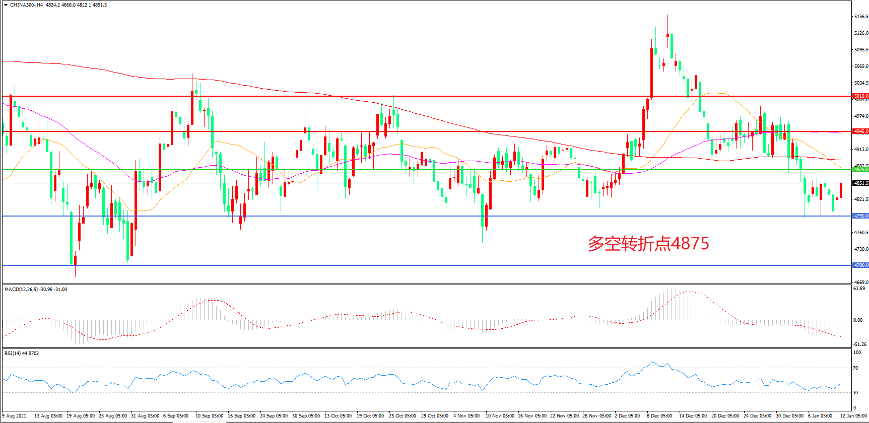 4小时图看,沪深300回踩4790后再度拉升,区间震荡迹象明显,均线下穿形成阻力,4790形成支撑, MACD绿柱增加,RSI指标走平,日内延续震荡概率较大。