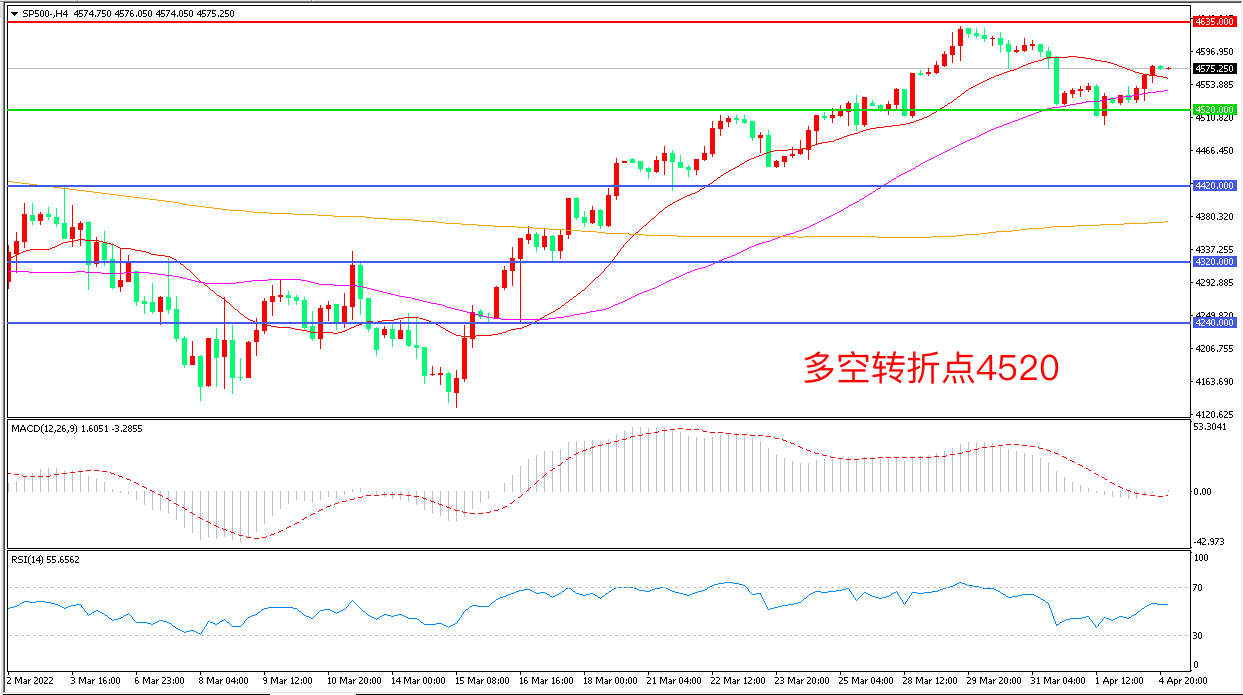 周一(4月4日),欧盟称将加速推进对俄实施进一步制裁,市场关注在欧洲进一步施加制裁形势下的俄乌谈判前景,蓝筹科技股所在的板块力挺美股反弹,标普500震荡走高,收报4574.55点。短期看市场正处于空头回补的后期阶段,美股本周能否企稳仍需关注联储会议纪要传递出的加息信号。