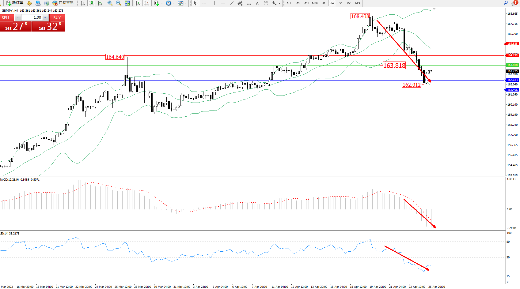 交易策略:163.818下方看跌,目标162.413、161.496