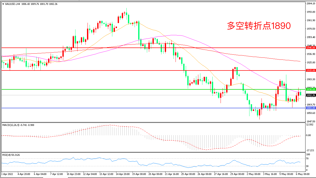 上周五(5月6日),新增非农数据表明就业市场较为强劲,美联储有继续强化鹰派预期可能,现货黄金延续弱势表现,收报1882.36美元/盎司。美元指数此前刷新二十年新高,一度升破104关口,欧元区正与更为严重的滞胀情况作斗争,美元进一步走强会对中期金价形成明显打压。