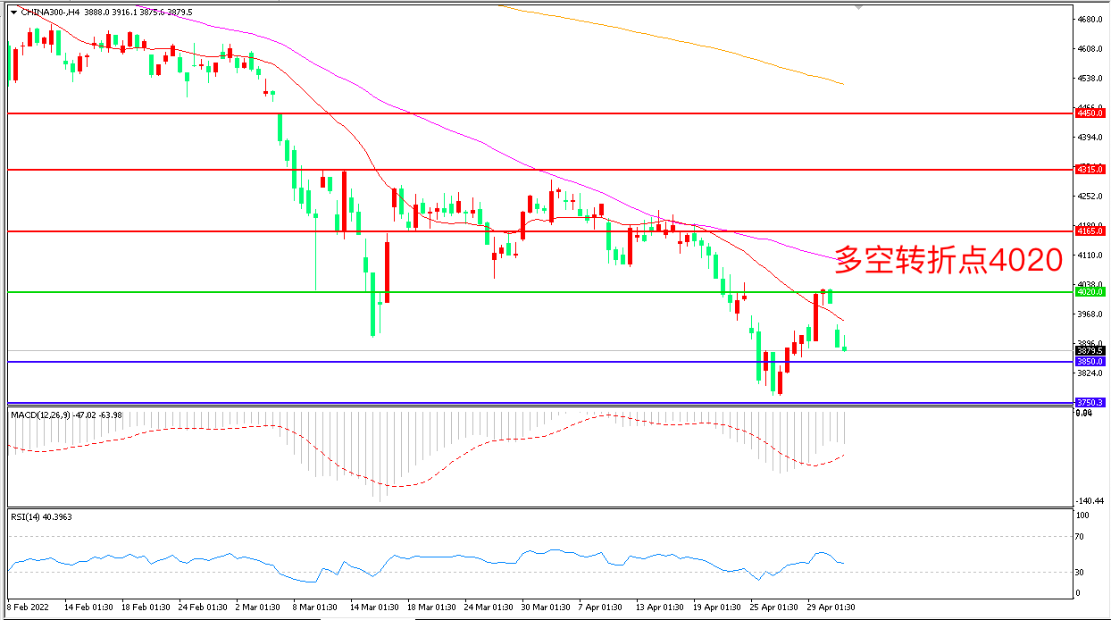 4小时图看,沪深300跳空低开后表现疲软,整体表现较弱,均线系统呈空头形态,MACD绿柱缩短,RSI指标走平,日内延续震荡概率较大。