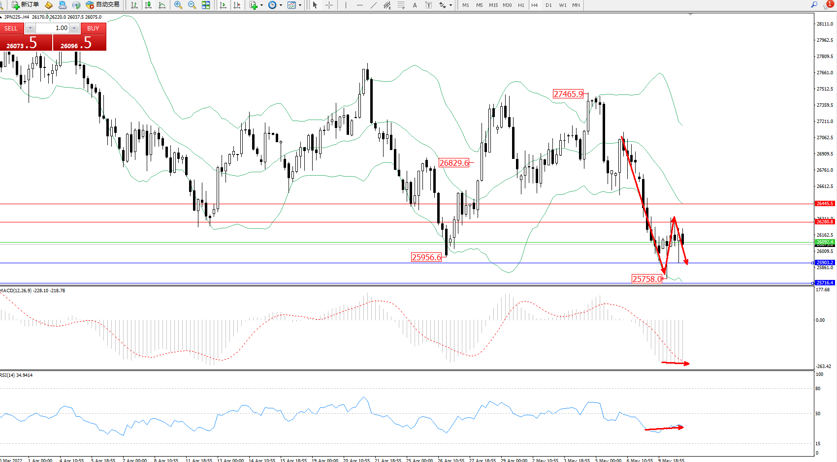 技术点评:空头力度延续布林带指标通道中下轨区间持续震荡下挫,低位抵达25758附近节点后开始回升震荡,短期或维持低位宽幅整理,布林带指标呈收口走势中,MACD指标处于空头区域低位维持弱势徘徊,RSI指标处于空头区域维持缓慢平移;