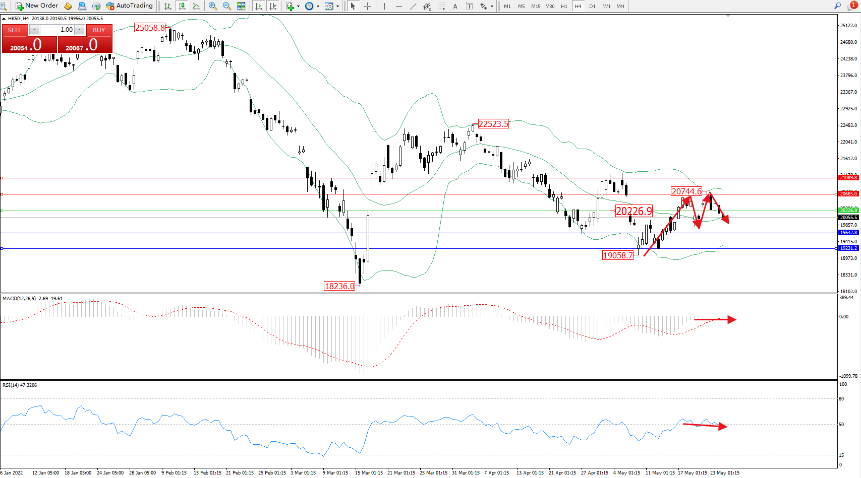 香港恒生指数5月24日(周二)收盘下跌357.96点,跌幅1.75%,报20112.1点;市场忧虑全球经济衰退,国际金融市场齐挫。港股三大指数全天维持跌势,恒指、恒生科技指数最终收跌1.75%及3.48%,二者均险守重要指数关口。权重科技股再度引领大市下挫,京东跌超5%,美团、百度跌超4%,腾讯、小米跌近3%;今日南下资金逆势净流入22.86亿港元,大市成交额1136亿港元。