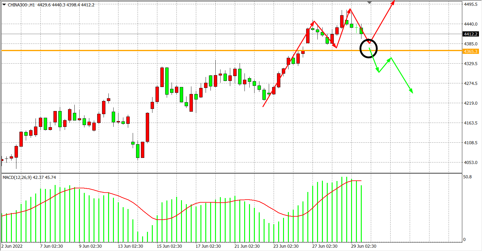 1小时图看,沪深300虽出现调整单仍维持在4365之上运行,同时MACD在零轴之上开始出现高位缩量,为调整修正的修好,趋势仍多头占优,调整过后有望重拾涨势。日内依旧以4365为多空分界线,在4365之上继续看涨,目标4500-4600,在4365之下看跌,目标4320-4190