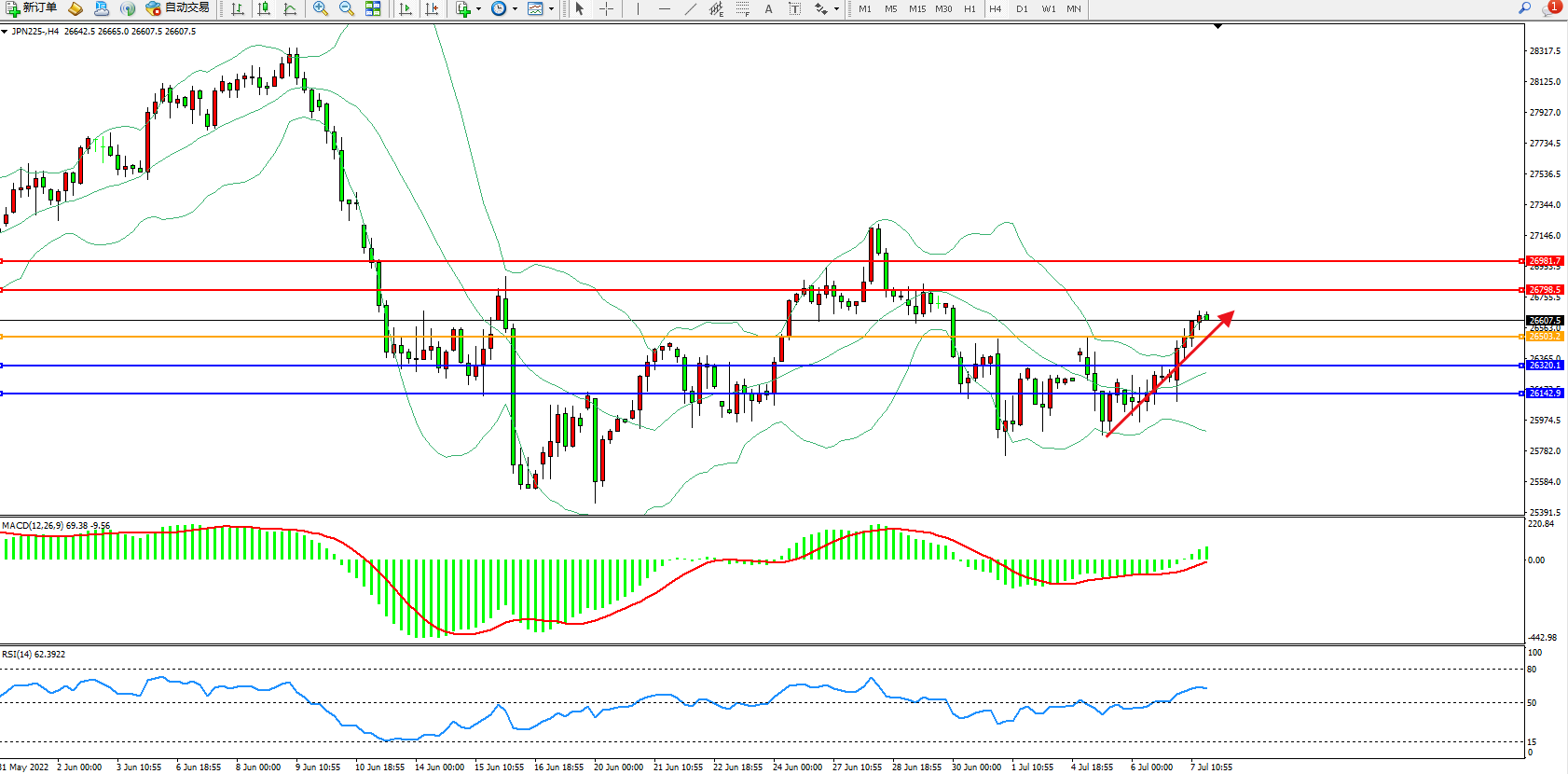 日经225指数7月7日(周四)收盘上涨382.17点,涨幅1.46%,报26501.50点。日本央行可能会考虑在本月晚些时候修订通胀和经济增长预测,可能会将季度通胀预期从4月份的1.9%上调至截至明年3月财年的2%或以上的目标水平,也可能会考虑将今年的经济增长预测从当前的2.9%下调。