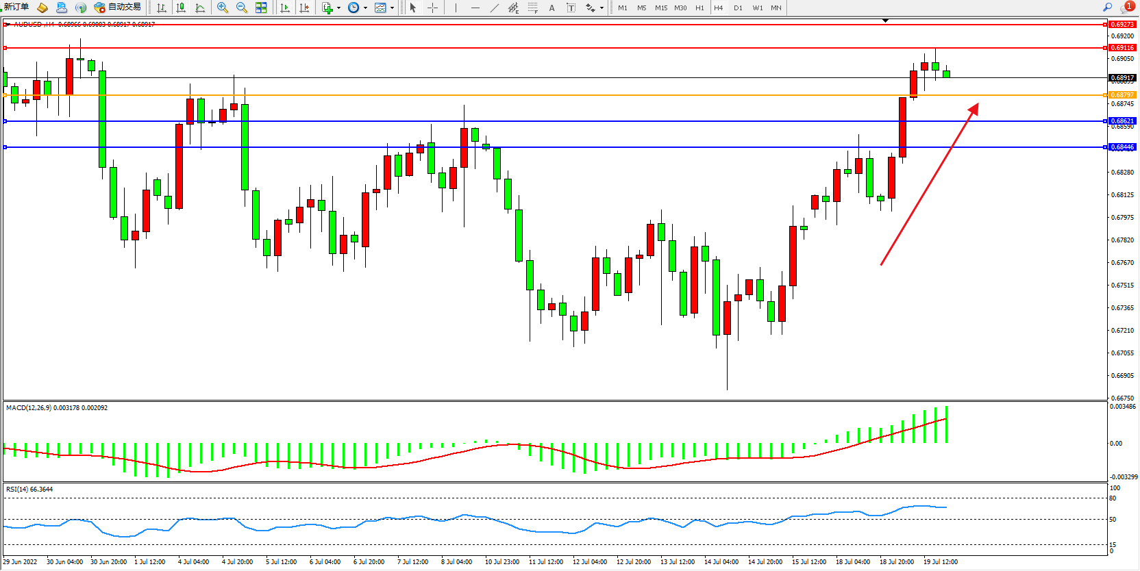 澳元兑美元维持高位0.68917附近震荡,澳洲联储认为有必要进一步收紧政策,因为即使在最近的加息之后,利率仍然过低,在劳动力市场强劲的情况下,无法抑制通胀预期。