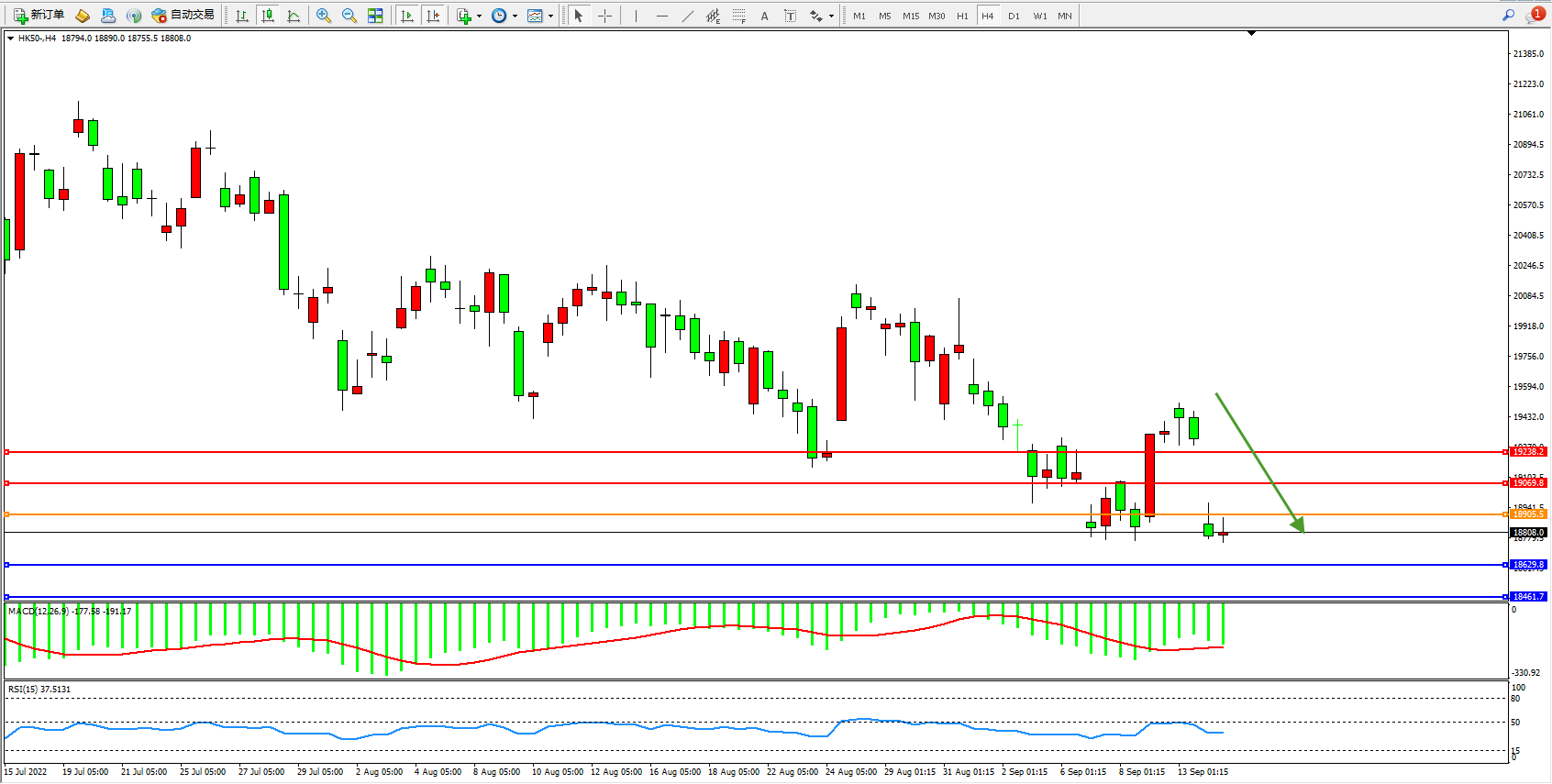 香港恒生指数9月14日(周三)收盘下跌479.76点,跌幅2.48%,报18847.1点;美国CPI高于预期使市场忧虑加息预期加大,全球金融市场全线下挫。港股三大指数全天维持大跌行情,恒指跌2.48%下挫近500点,国指跌2.45%,恒生科技指数跌2.85%,再度失守4000点整数关。大型科技股集体下跌令大市承压,小米、美团、腾讯等均下跌。