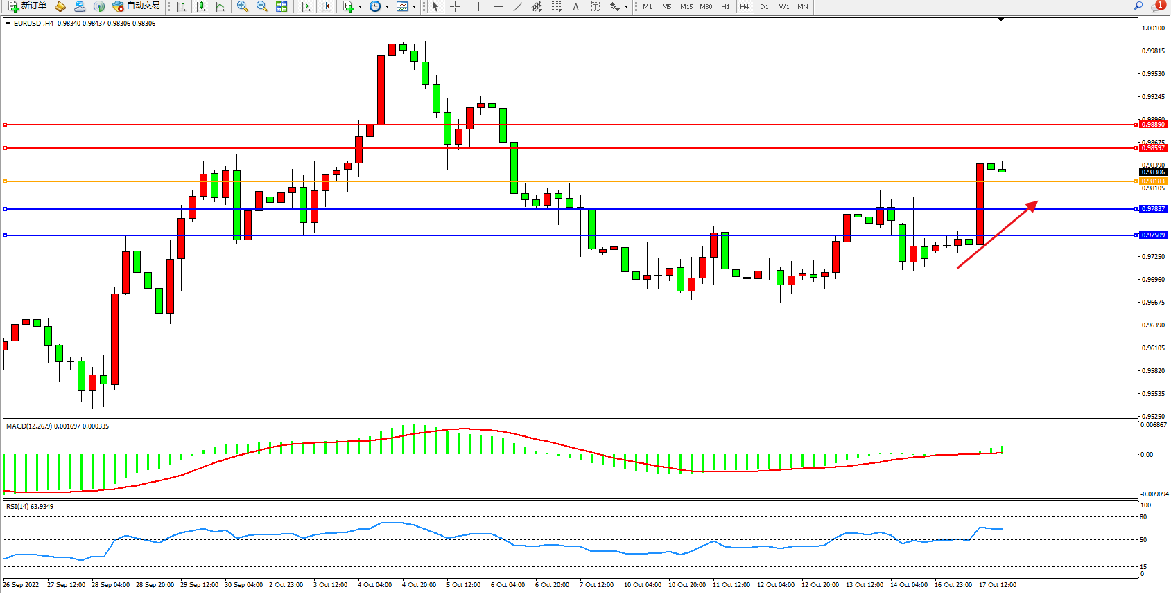 欧元美元EURUSD—4小时K线图显示: