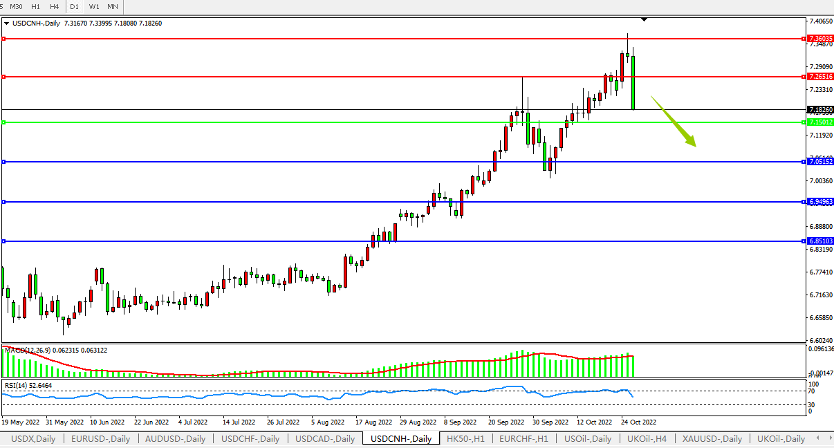 备选策略:在7.1500之下,看跌,目标价位为7.0500、6.9500