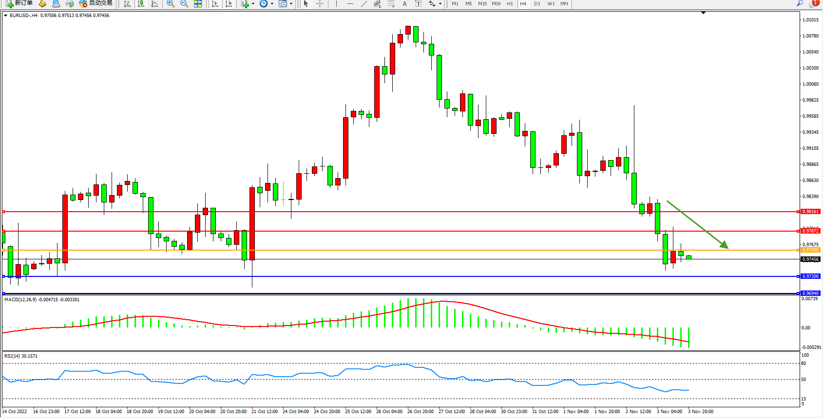 欧元兑美元维持0.97456附近震荡,欧元区第三季度国内生产总值较第二季度大幅放缓,分析师预计经济将很快陷入衰退,因俄乌冲突推高能源和食品价格,令家庭和企业疲于应对。